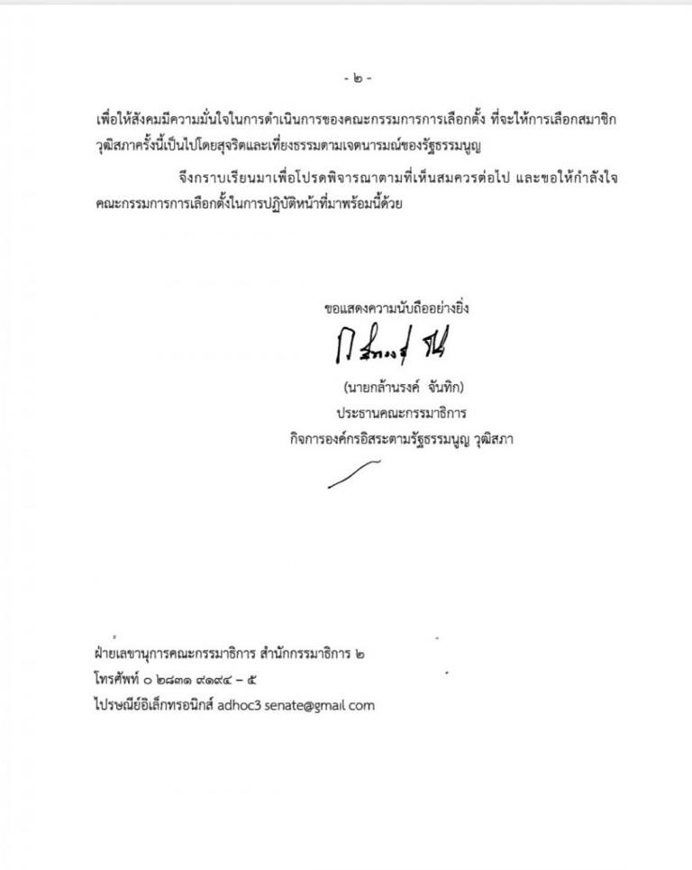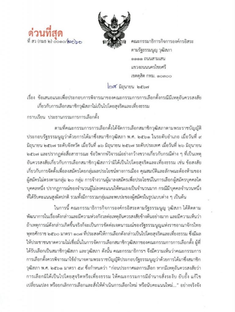 ประธานกมธ.องค์กรอิสระ วุฒิสภา ส่งหนังสือด่วนถึงกกต.เหตุอันควรสงสัยเกี่ยวกับการเลือกสมาชิกวุฒิสภาไม่เป็นไปโดยสุจริตและเที่ยงธรรม ขอทบทวนให้ดีก่อนประกาศรับรองผล