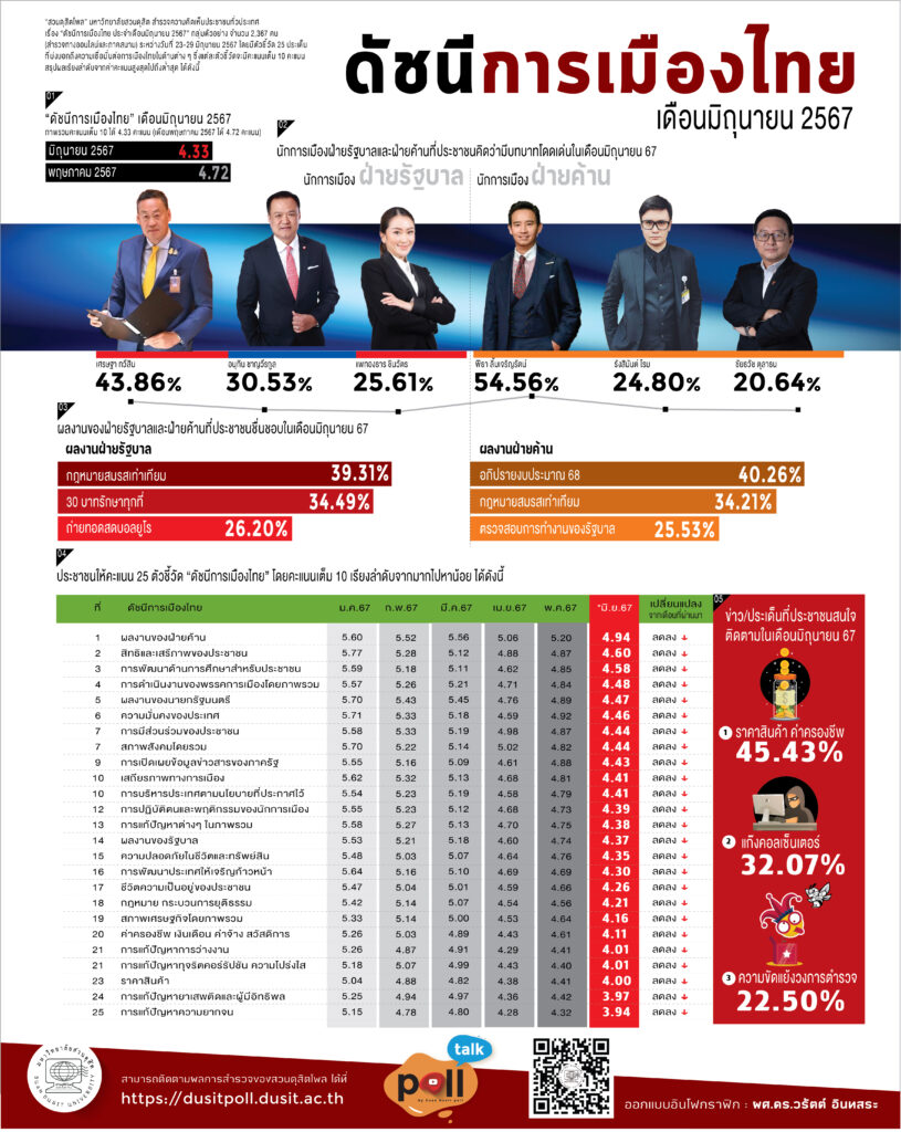 “สวนดุสิตโพล” มหาวิทยาลัยสวนดุสิต เปิดเผยผลสำรวจความคิดเห็นประชาชนทั่วประเทศ เรื่อง “ดัชนีการเมืองไทย ประจำเดือนมิถุนายน 2567” จากกลุ่มตัวอย่างจำนวน 2,367 คน สำรวจทางออนไลน์และภาคสนาม ระหว่างวันที่ 23-29 มิถุนายน 2567 โดยมีตัวชี้วัด 25 ประเด็นที่บ่งบอกถึงความเชื่อมั่นต่อการเมืองไทยในด้านต่าง ๆ ซึ่งแต่ละตัวชี้วัดจะมีคะแนนเต็ม 10 คะแนน โดย พบว่า กลุ่มตัวอย่างให้คะแนนภาพรวมดัชนีการเมืองไทยประจำเดือนมิถุนายน 2567 เฉลี่ย 4.33 คะแนน ลดลง จากเดือนพฤษภาคม 2567 ที่ได้ 4.72 คะแนน