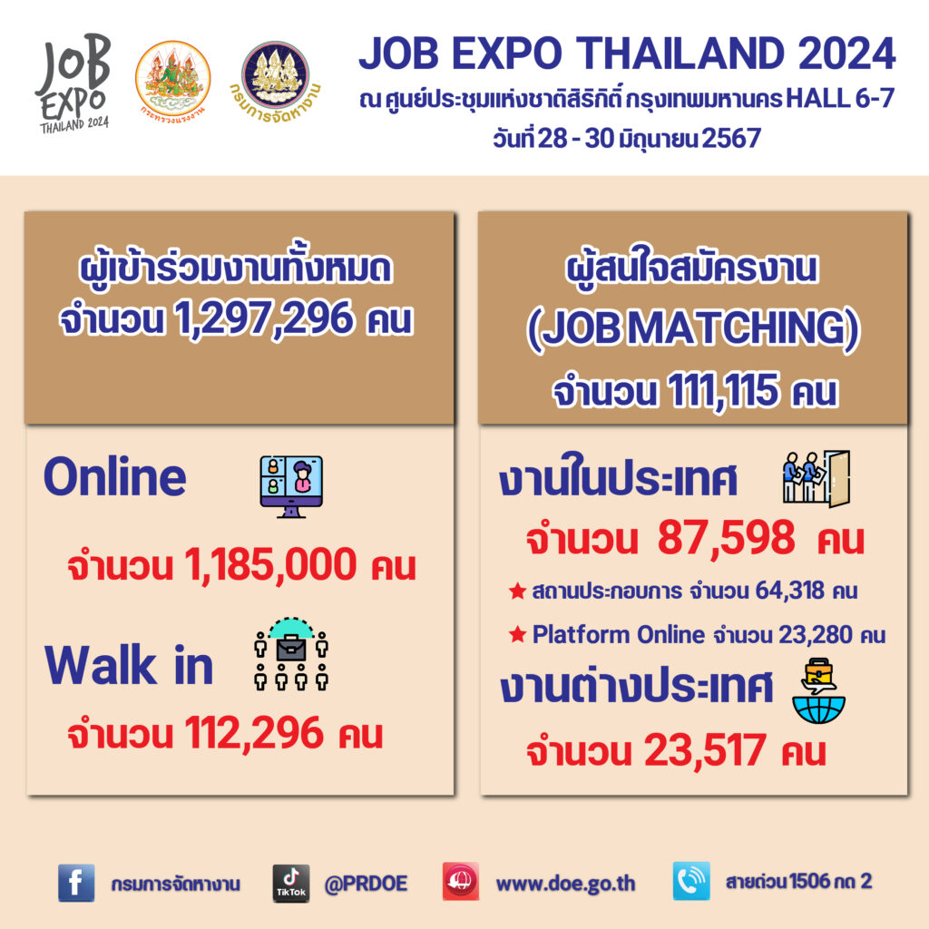 นายพิพัฒน์ รัชกิจประการ รัฐมนตรีว่าการกระทรวงแรงงาน ประกาศความสำเร็จยิ่งใหญ่ของงาน JOB EXPO THAILAND 2024 มหกรรมหางานสร้างรายได้ที่สนุกที่สุดที่จัดขึ้นระหว่างวันที่ 28 – 30 มิถุนายน 2567 ณ ศูนย์การประชุมแห่งชาติสิริกิติ์ งานนี้มีผู้สนใจเข้าร่วมกว่า 1,297,296 คน ทาง Online 1,185,000 คน และผู้ที่ Walk In 112,296 คน ซึ่งรวมถึงนักศึกษาจบใหม่ ผู้สูงวัย คนพิการ และประชาชนทั่วไป