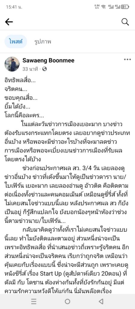 ช่วงก่อนประกาศผลเลือก สว. 3-4 วัน เลยลองดูข่าวอื่นบ้าง ข่าวที่เด้งขึ้นมาให้ดูเป็นข่าวดารา นายณภัทร กับใบเฟิร์น เยอะมาก เลยลองอ่านดู อ้าวติด คือติดตามต่อเนื่องทั้งข่าวและการแสดงความคิกเห็นของประชาชนเปรียบเหมือนดูซี่รี่ส์ ทั้งที่ไม่เคยสนใจข่าวแบบนี้เลย