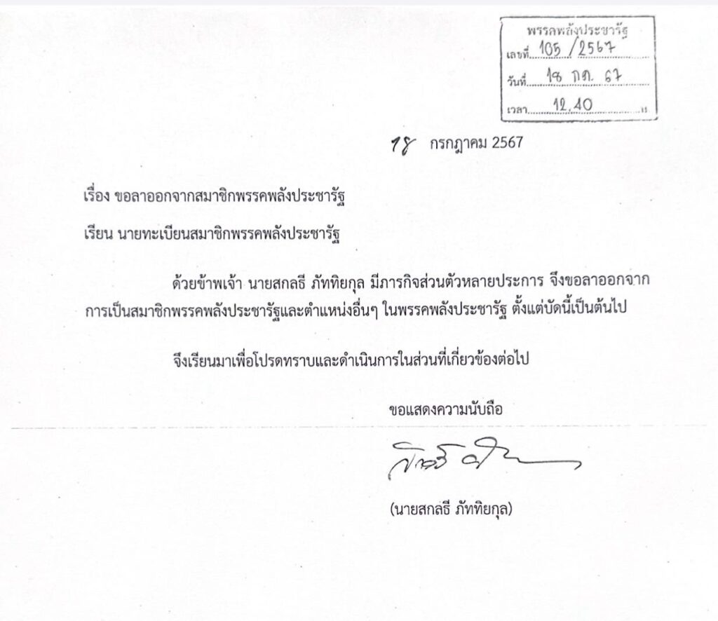 นายสกลธี ภัททิยกุล ได้ยื่นหนังสือ ขอลาออกจากสมาชิกพรรคพลังประชารัฐ โดยทำหนังสือถึงนายทะเบียนสมาชิกพรรคพลังประชารัฐ มีใจความว่า ด้วยข้าพเจ้า นาธสกลธี ภัททิยกุล มีภารกิจส่วนตัวหลายประการ จึงขอลาออกจากการเป็นสมาชิกพรรคพลังประชารัฐ และตำแหน่งอื่นๆ ในพรรคพลังประชารัฐ ตั้งแต่บัดนี้เป็นต้นไป จึงเรียนมาเพื่อโปรดทราบและดำเนินการในส่วนที่เกี่ยวข้องต่อไป ทั้งนี้ ในหนังสือลาออก ระบุลงวันที่ 18 กรกฎาคม 2567