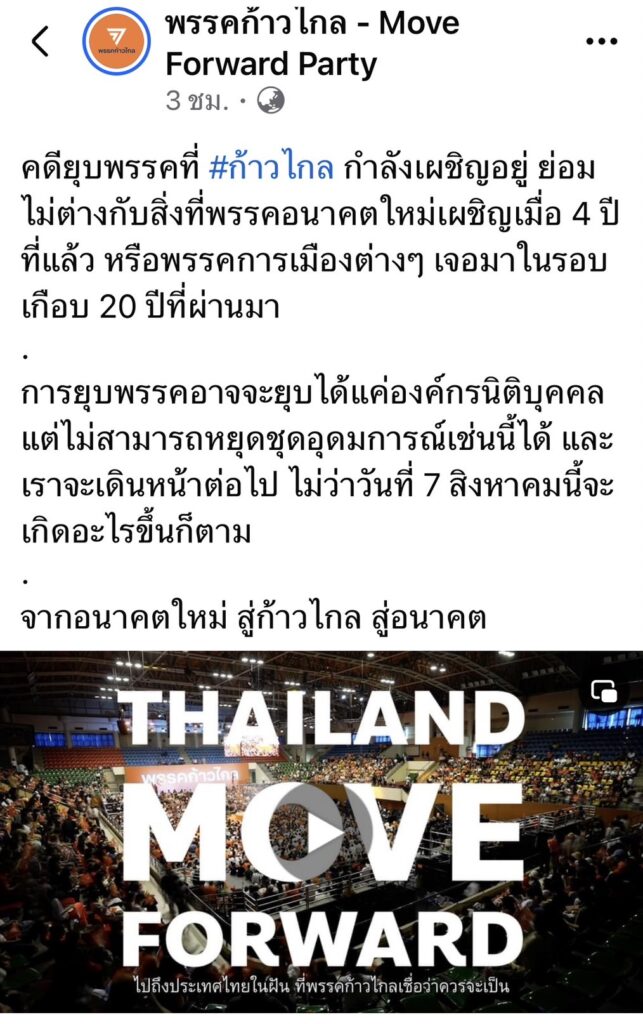 พร้อมข้อความระบุ ว่า คดียุบพรรคที่พรรคก้าวไกล กำลังเผชิญอยู่ ไม่ต่างกับสิ่งที่พรรคอนาคตใหม่เผชิญเมื่อ 4 ปีที่แล้ว หรือพรรคการเมืองต่าง ๆ เจอมาในรอบเกือบ 20 ปีที่ผ่านมา การยุบพรรค อาจจะยุบได้แค่องค์กรนิติบุคคล แต่ไม่สามารถหยุดชุดอุดมการณ์เช่นนี้ได้ และพรรคฯ จะเดินหน้าต่อไป ไม่ว่าวันที่ 7 สิงหาคมนี้จะเกิดอะไรขึ้นก็ตาม “จากอนาคตใหม่ สู่ก้าวไกล สู่อนาคต”