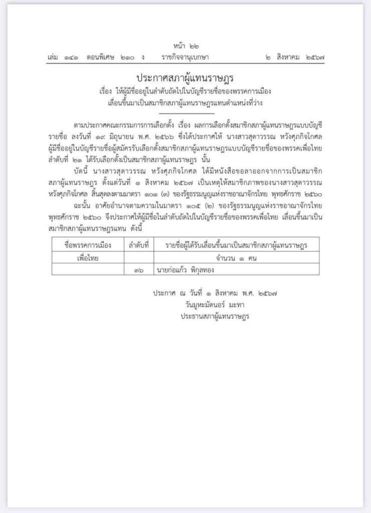 บัดนี้ นางสาวสุดาวรรณ หวังศุภกิจโกศล ได้มีหนังสือขอลาออกจากการเป็นสมาชิกสภาผู้แทนราษฎร ตั้งแต่วันที่ 1 สิงหาคม 2567 เป็นเหตุให้สมาชิกภาพของนางสาวสุดาวรรณ หวังศุภกิจโกศล สิ้นสุดลงตามมาตรา 101 (3) ของรัฐธรรมนูญแห่งราชอาณาจักรไทย พุทธศักราช 2560 ฉะนั้น อาศัยอำนาจตามความในมาตรา 105 (2) ของรัฐธรมนูญแห่งราชอาณาจักรไทย พุทธศักราช 2560 จึงประกาศให้ นายก่อแก้ว พิกุลทอง คือ ผู้มีชื่อในลำดับถัดไปในบัญชีรายชื่อของพรรคเพื่อไทย เลื่อนขึ้นมาเป็นสมาชิกสภาผู้แทนราษฎรแทน