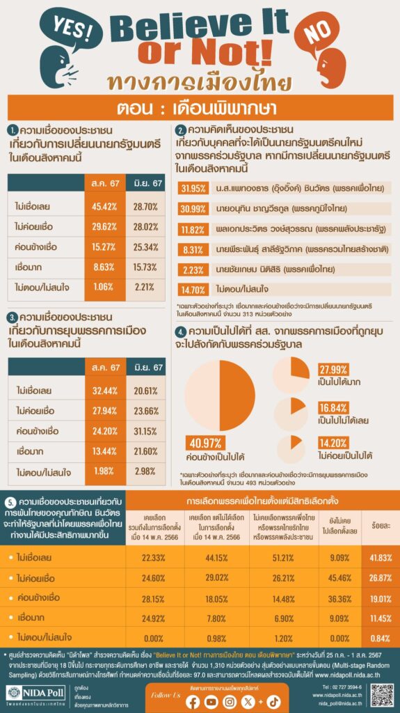 ศูนย์สำรวจความคิดเห็น “นิด้าโพล” สถาบันบัณฑิตพัฒนบริหารศาสตร์ (นิด้า) เปิดเผยผลการสำรวจของประชาชน เรื่อง “Believe It or Not! ทางการเมืองไทย ตอน เดือนพิพากษา” ทำการสำรวจระหว่างวันที่ 25 กรกฎาคม-1 สิงหาคม 2567 จากประชาชนที่มีอายุ 18 ปีขึ้นไปทั่วประเทศ รวมทั้งสิ้น จำนวน 1,310 หน่วย