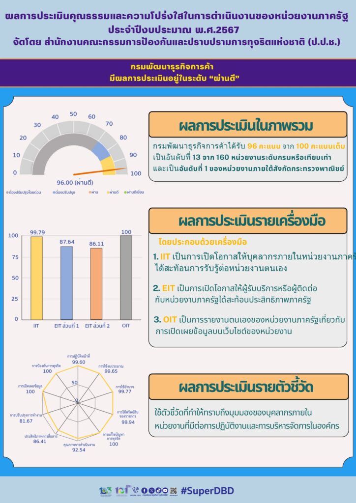 กรมพัฒนาธุรกิจฯ ปลื้ม ผลการประเมินคุณธรรมและความโปร่งใสในการดำเนินงาน “ระดับผ่านดี” จาก ป.ป.ช. ได้ 96 คะแนน เป็นอันดับ 13 จาก 160 หน่วยงานระดับกรม