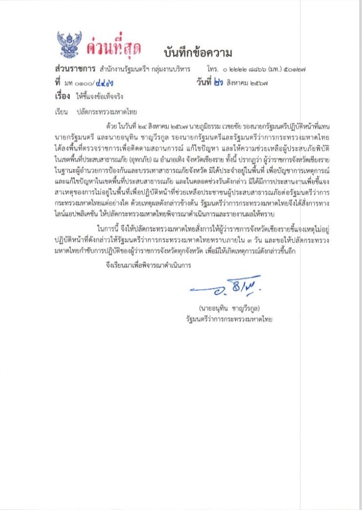 นายอนุทิน ชาญวีรกูล รองนายกรัฐมนตรี ในฐานะรัฐมนตรีว่าการกระทรวงมหาดไทย ส่งหนังสือด่วนที่สุด ถึงปลัดกระทรวงมหาดไทย เรื่อง ให้ชี้แจงข้อเท็จจริง มีเนื้อหาระบุว่า ด้วยในวันที่ 24 สิงหาคม2567 นายภูมิธรรม เวชยชัย รองนายกรัฐมนตรี ปฏิบัติหน้าที่แทนนายกรัฐมนตรี และนายอนุทิน ชาญวีรกูล รองนายกรัฐมนตรี และรัฐมนตรีว่าการกระทรวงมหาดไทย ได้ลงพื้นที่ตรวจราชการเพื่อติดตามสถานการณ์แก้ไขปัญหา และให้ความช่วยเหลือผู้ประสบภัยพิบัติ ในเขตพื้นที่ประสบสาธารณภัย (อุทกภัย) ณ อำเภอเทิง จังหวัดเชียงราย