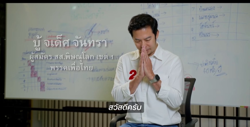 ความเคลื่อนไหวการหาเสียงเลือกตั้งโค้งสุดท้ายจังหวัดพิษณุโลก ของ “บู้ นายจเด็ศ” พรรคเพื่อไทย แบ่งเป็นช่วงเช้ายังคงลงพื้นที่พบปะประชาชน พ่อค้าแม่ค้าตลาดต่างๆ เพื่อขอเสียงสนับสนุนขณะเดียวกัน ยังได้อัดคลิปโพสต์ลงเฟซบุ๊กความยาว 1.44 เพื่อสื่อสารกับประชาชน โดย “บู้ นายจเด็ศ” ระบุว่า ช่วงโค้งสุดท้ายการเลือกตั้ง ถือว่าเหลือเวลาน้อยมากในการสื่อสารกับประชาชนชาวพิษณุโลก