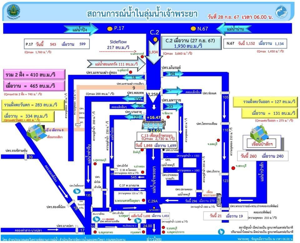 กรมชลประทาน รายงานสถานการณ์น้ำลุ่มเจ้าพระยา วันที่ 28 ก.ย.67 เวลา 06.00 น.
