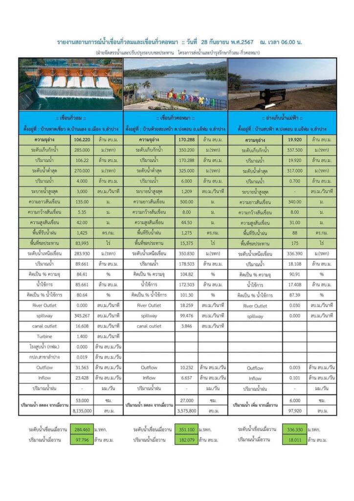 ส่วนโครงการส่งน้ำและบำรุงรักษากิ่วลม-กิ่วคอหมา จ.ลำปาง รายงานข้อมูลน้ำ รายชั่วโมงของเขื่อนกิ่วคอหมา และเขื่อนกิ่วลม เวลา 09.00 น. โดยเขื่อนกิ่วลม ระบายน้ำที่อัตรา 357 ลูกบาศ์กเมตร ต่อวินาที