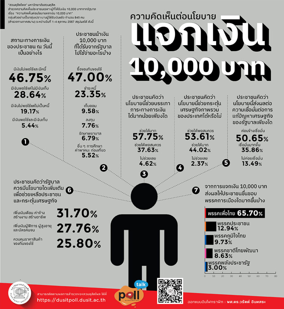 “สวนดุสิตโพล” มหาวิทยาลัยสวนดุสิต เปิดเผยผลสำรวจความคิดเห็นต่อนโยบายแจกเงิน 10,000 บาท ทำการสำรวจ จากกลุ่มตัวอย่างที่เป็นกลุ่มเปราะบาง ผู้ได้รับเงินแล้ว จำนวน 845 คน ระหว่างวันที่ 1-4 ต.ค.ที่ผ่านมา พบว่า สถานะทางการเงินของกลุ่มตัวอย่าง ส่วนใหญ่ ร้อยละ 46.7 มีเงินไม่พอใช้ และมีหนี้, ร้อยละ 28.64 มีเงินพอใช้แต่ไม่มีเงินเก็บ,ร้อยละ 19.17 มีเงินไม่พอใช้แต่ไม่เป็นหนี้ ส่วนเมื่อถามว่า นำเงินที่ได้ไปใช้อะบ้าง ร้อยละ 47.0 นำไปใช้ซื้อของกินของใช้, ร้อยละ 23.35 ชำระหนี้ และ ร้อยละ 9.58 เก็บออม