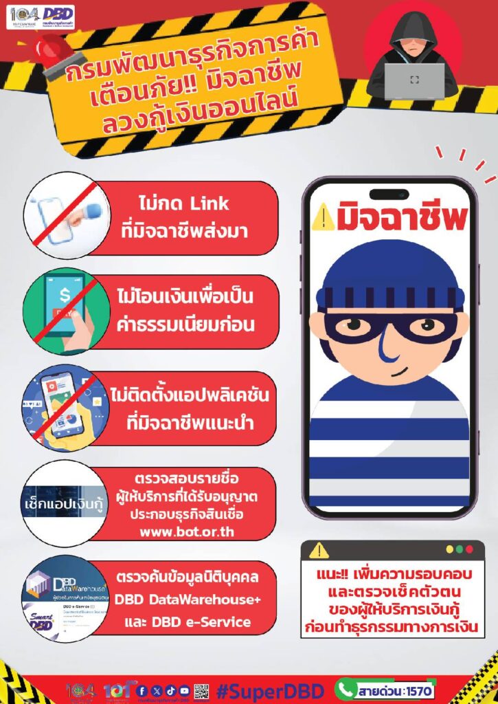 กรมพัฒนาธุรกิจฯ เตือนผู้ประสบภัยพิบัติที่ต้องการกู้เงินผ่านออนไลน์ ระวังมิจฉาชีพ หลังได้รับร้องเรียนมีการหลอกลวง แอบอ้างและปลอมแปลงข้อมูลนิติบุคคล