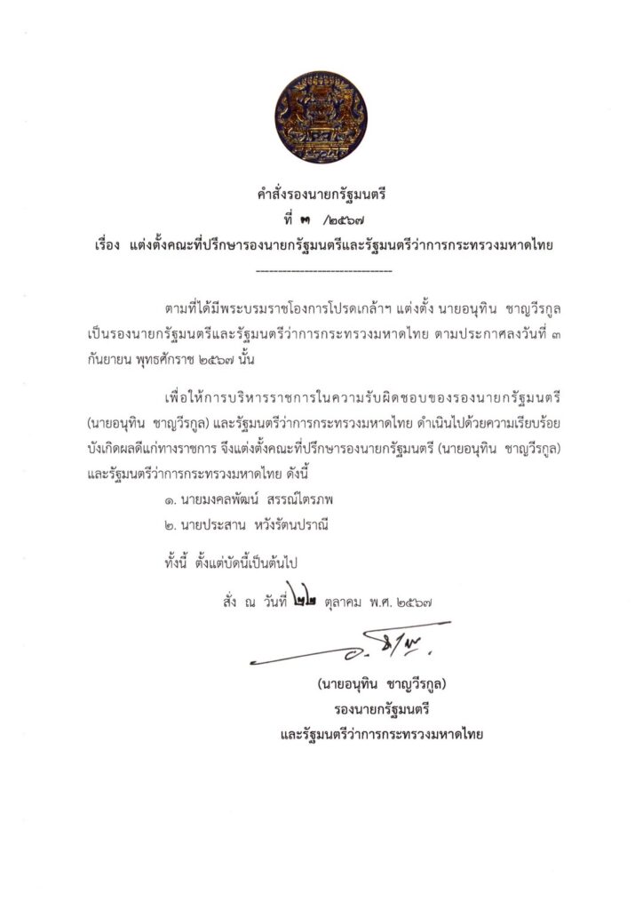 มีรายงานว่า นายอนุทิน ชาญวีรกูล รองนายกรัฐมนตรี และรัฐมนตรีว่าการกระทรวงมหาดไทย มีคำสั่งรองนายกรัฐมนตรี ที่ 3/2567เรื่อง แต่งตั้งคณะที่ปรึกษารองนายกรัฐมนตรี และรัฐมนตรีว่าการกระทรวงมหาดไทย โดยในคำสั่งระบุว่า ตามที่ได้มีพระบรมราชโองการโปรดเกล้าๆ แต่งตั้ง นายอนุทิน ชาญวีรกูล เป็นรองนายกรัฐมนตรีและรัฐมนตรีว่าการกระทรวงมหาดไทย ตามประกาศลงวันที่ 22 กันยายน พุทธศักราช 2567 นั้น