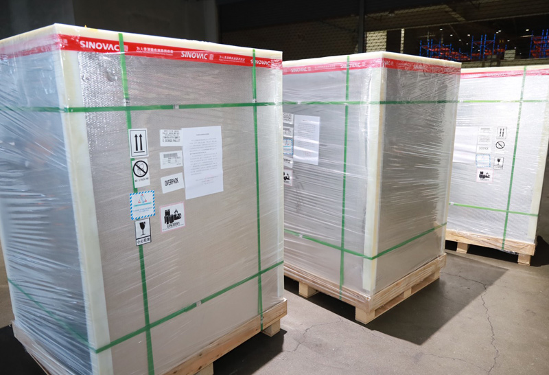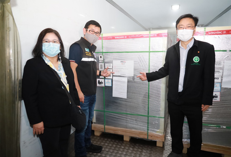 นพ.วิฑูรย์ ด่านวิบูลย์ ผู้อำนวยการองค์การเภสัชกรรม กล่าวว่า จากที่รัฐบาลได้มอบหมายให้กระทรวงสาธารณสุขโดยองค์การเภสัชกรรมดำเนินการจัดหาวัคซีนโควิด-19 เร่งด่วน จำนวน 2 ล้านโดส โดยมีการเจรจาจัดซื้อจากบริษัท ซิโนแวค ไลฟ์ ซายน์ จำกัด สาธารณรัฐประชาชนจีน โดยวัคซีนล็อตแรก ได้จัดส่งให้องค์การเภสัชกรรมไปแล้ว เมื่อวันที่ 24 ก.พ.64 จำนวน 2 แสนโดส ลอตที่2 เมื่อวันที่ 22 มี.ค.64 จำนวน 8 แสนโดส และในวันนี้ได้มีการส่งมอบล็อตที่ 3 อีกจำนวน 1 ล้านโด๊ส โดยวัคซีนดังกล่าวมีการ จัดส่งด้วยกล่องที่มีการควบคุมอุณหภูมิ (Passive cold carton) ระหว่าง 2-8 องศา ตลอดเวลา ที่สามารถเก็บอุณหภูมิได้นานถึง 96 ชั่วโมง วัคซีนทั้งหมดนี้จะขนส่งไปจัดเก็บยังคลัง สำรองวัคซีนโควิด-19 ซึ่งมีการควบคุมอุณหภูมิระหว่าง 2-8 องศา ด้วยเช่นกัน ที่ศูนย์กระจายสินค้าของบริษัท ดีเคเอสเอช (ประเทศไทย) จำกัด จากนั้นจะดำเนินการตรวจรับและส่งให้ กรมวิทยาศาสตร์การแพทย์ ตรวจสอบคุณภาพ มาตรฐาน และเอกสารต่างๆ อีกครั้งและเมื่อผ่านการตรวจสอบทุกขั้นตอนแล้ว จะส่งให้กรมควบคุมโรคตรวจรับวัคซีนและกระจายไปยังหน่วยบริการ และสถานพยาบาลต่างๆ เพื่อฉีดให้กับกลุ่มเป้าหมายตามแผนที่กำหนดโดยวัคซีนนี้จะฉีดให้กลุ่มเป้าหมาย ที่มีอายุ 18-59 ปี คนละ 2 โดส ขณะที่ทั่วโลกมีการฉีดวัคซีนจากบริษัทซิโนแวคไปแล้ว ประมาณ 200 ล้านโดส