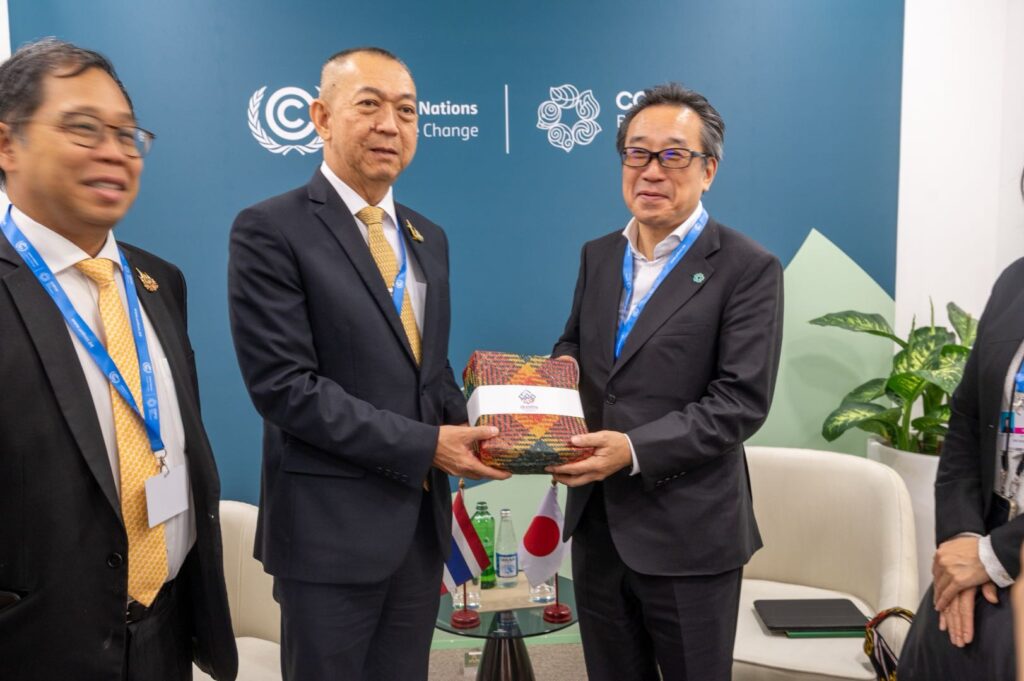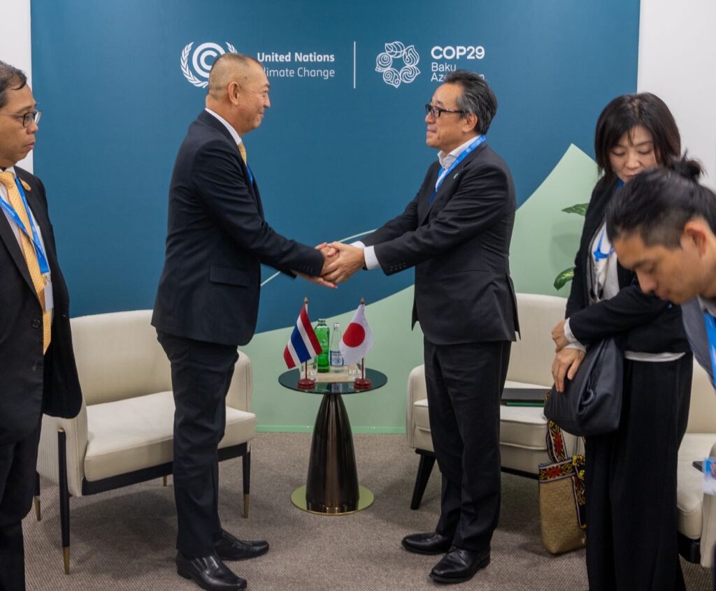 นายเฉลิมชัย ศรีอ่อน รัฐมนตรีว่าการกระทรวงทรัพยากรธรรมชาติและสิ่งแวดล้อม ในฐานะหัวหน้าคณะผู้แทนไทย หารือทวิภาคีกับนาย Yutaka Matsuzawa, Vice Minister for Global Environmental Affairs กระทรวงสิ่งแวดล้อมแห่งประเทศญี่ปุ่น ในห้วงการประชุมรัฐภาคีกรอบอนุสัญญาสหประชาชาติว่าด้วยการเปลี่ยนแปลงสภาพภูมิอากาศ สมัยที่ 29 (COP 29) ณ กรุงบากู สาธารณรัฐอาเซอร์ไบจาน ร่วมหารือ เพื่อเสริมสร้างความร่วมมือทั้งด้านคาร์บอนเครดิตระหว่างประเทศ รวมถึงการถ่ายทอดเทคโนโลยีและองค์ความรู้ในการจัดการภัยพิบัติอันเนื่องมาจากสภาพภูมิอากาศ โดยผลการหารือที่สำคัญ คือ ไทยและญี่ปุ่นมีความยินดีต่อความเป็นพันธมิตรร่วมดำเนินงานด้านการเปลี่ยนแปลงสภาพภูมิอากาศ และพร้อมเสริมสร้างความร่วมมือให้แน่นแฟ้นมากยิ่งขึ้น ในการขับเคลื่อนความร่วมมือทั้งการลดก๊าซเรือนกระจก