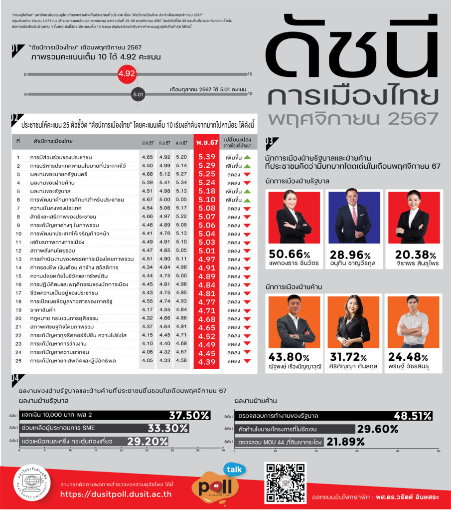 “สวนดุสิตโพล” ดัชนีการเมืองเดือน พย.สอบตก คะแนนลดลงจากเดือนก่อน ผลงานรัฐบาลที่ชื่นชอบแจกหมื่น เฟส 2 “แพทองธาร” เด่นสุด 50.66%
