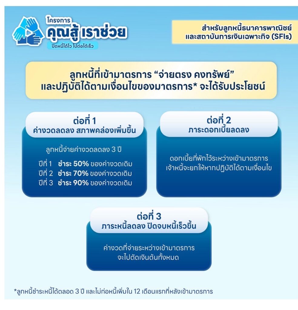 เพื่อให้ความช่วยเหลือลูกหนี้รายย่อยและ SMEs เฉพาะกลุ่ม หลังจากที่วันนี้ ครม.ได้ผ่านความเห็นชอบแล้ว 2 มาตรการ อาทิ มาตรการ “จ่ายตรง คงทรัพย์” เป็นการช่วยเหลือลูกหนี้สินเชื่อบ้าน รถ และ SMEs ขนาดเล็กที่มีวงเงินหนี้ไม่สูงมาก ให้สามารถรักษาทรัพย์สินที่เป็นหลักประกันทั้งบ้าน รถ และสถานประกอบการไว้ได้ โดยเป็นการปรับโครงสร้างหนี้แบบลดค่างวดและลดภาระดอกเบี้ย โดยค่างวดที่จ่ายจะนำไปตัดเงินต้น 1.1 รูปแบบการให้ความช่วยเหลือ (1) ลดค่างวดเป็นระยะเวลา 3 ปี