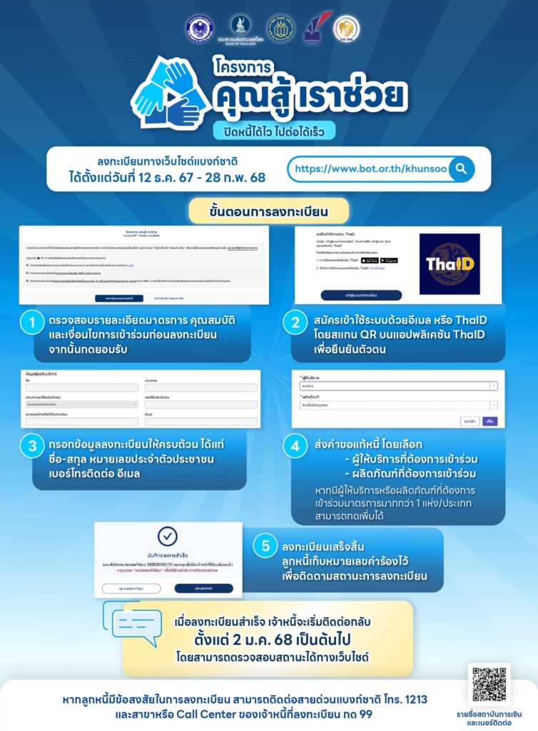โครงการ “คุณสู้ เราช่วย” พร้อมทำพิธีลงนามบันทึกข้อตกลงความร่วมมือและหนังสือแสดงเจตนารมณ์ระหว่าง กระทรวงการคลัง ธนาคารแห่งประเทศไทยสมาคมธนาการไทย (TBA) และสมาคมธนาคารนานาชาติ (A/B) สำนักงานใหญ่ โดยนายพิชัย กล่าวว่า เพื่อให้ความช่วยเหลือลูกหนี้รายย่อย และ SMEs เนื่องจากเห็นว่า หนี้ครัวเรือนเป็นปัญหาเชิงโครงสร้างที่ส่งผลกระทบต่อความเป็นอยู่ที่ดีของประชาชน และการเติบโตอย่างยั่งยืนของเศรษฐกิจไทย ทุกภาคส่วนจึงได้ร่วมกันผลักดันมาตรการชั่วคราวเพิ่มเติม