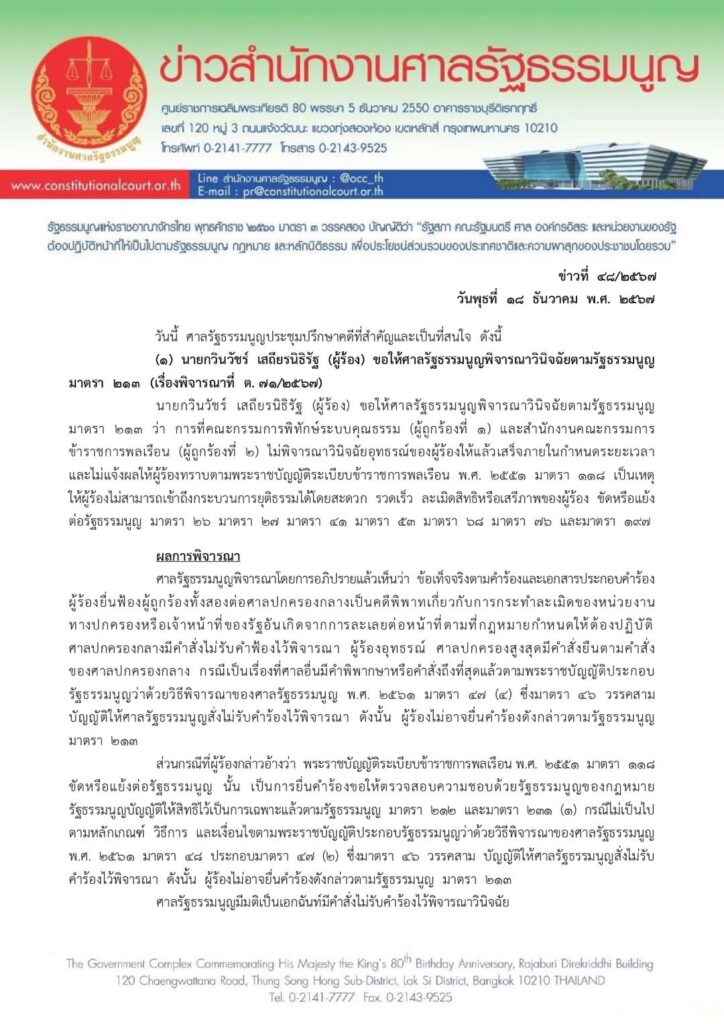 ตุลาการศาลรัฐธรรมนูญ ได้พิจารณาคำร้องของนายคงเดชา ชัยรัตน์ ขอให้ศาลรัฐธรรมนูญพิจารณาวินิจฉัยตามรัฐธรรมนูญมาตรา 49 ว่ารัฐมนตรีว่าการกระทรวงยุติธรรม