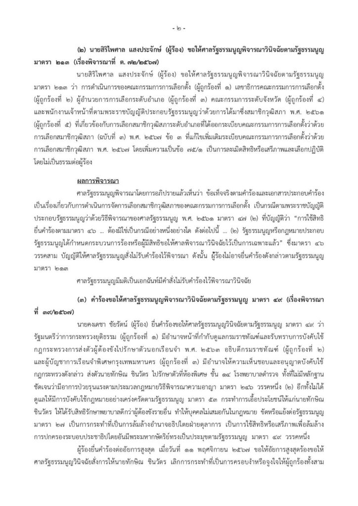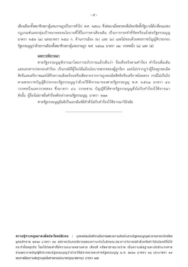 ศาลรัฐธรรมนูญได้พิจารณาโดยการอภิปรายแล้วเห็นว่า ข้อเท็จจริงตามคำร้องและเอกสารประกอบคำพร้อมเป็นเพียงการกล่าวอ้างว่าผู้ถูกร้องทั้ง 3 ปฏิบัติหรือละเว้นการปฏิบัติหน้าที่โดยไม่ชอบด้วยกฎหมายไม่ปรากฏข้อเท็จจริงหรือพยานหลักฐานอื่นที่ชัดเจนเพียงพอและยังห่างไกลเกินกว่าเหตุที่แสดงให้เห็นได้ว่าผู้ถูกร้องทั้ง 3กระทำการอันเป็นการใช้สิทธิเสรีภาพผู้พิการล้มล้างการปกครองระบอบประชาธิปไตยอันมีพระมหากษัตริย์ทรงเป็นประมุขกรณีจึงไม่ต้องด้วยหลักเกณฑ์และวิธีการตามรัฐธรรมนูญจึงมีมติเป็นเอกฉันมีคำสั่งไม่รับคำร้องไว้พิจารณา