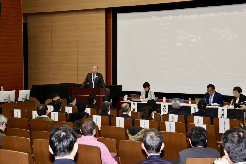 นายพิชัย ได้รับฟังและตอบคำถามจากนักวิชาการญี่ปุ่น ซึ่งมีความเชี่ยวชาญการเมืองไทย ซึ่งมีการถามถึงที่ผ่านตั้งแต่การปฏิวัติ ในช่วง 10 ปีมีการชุมนุมของกลุ่มคนเสื้อแดงเสื้อเหลือง ทำให้นักลงทุนญี่ปุ่นที่ลงทุนอยู่ในพื้นที่ใกล้เคียงกันชุมนุมสูญเสียกำไรไปเป็นจำนวนมาก และสมัยรัฐบาลของนายเศรษฐาทวี สินมี นักธุรกิจญี่ปุ่น ความเข้าใจว่าการเมืองไทยไม่มีความมั่นคงเท่าที่ควร และเมื่อดูจากสภาพการของประเทศไทยในปัจจุบัน เห็นว่ายังคงมีกลุ่มผู้ชุมนุมของเสื้อสีต่างๆ นักลงทุนกลัวว่าจะเกิดเหตุการณ์เหมือนในอดีต