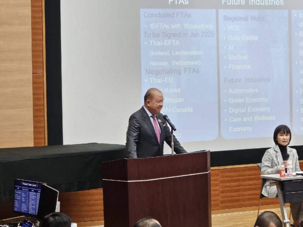 เห็นได้จากการร้องเรียนที่เกี่ยวข้องกับนายทักษิณ ชินวัตร ศาลก็มีการยกฟ้อง หากเป็นสมัยก่อนคงโดนยุบพรรคไปแล้ว เชื่อว่าทุกคนในประเทศอยากให้เศรษฐกิจเติบโต ซึ่งก็เป็นสาเหตุที่ตนเองเดินทางมาญี่ปุ่นในครั้งนี้ การที่มาพบนักลงทุนญี่ปุ่น เชื่อว่าจะทำให้เศรษฐกิจไทยก้าวหน้าต่อไปได้ หากนักลงทุนญี่ปุ่นกลับมาเยอะๆ ไม่อยากให้ 90% ของนักลงทุนญี่ปุ่นหนีกลับบ้านอีก