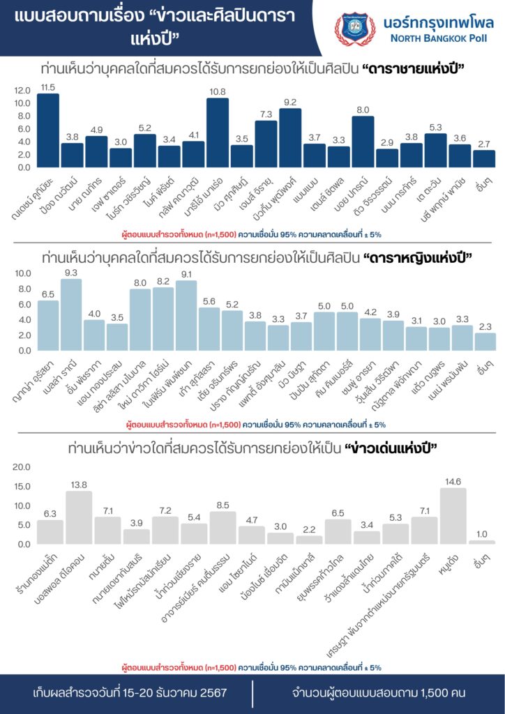 ผศ.ดร.สานิต ศิริวิศิษฐ์กุล หัวหน้าศูนย์สำรวจความคิดเห็น นอร์ทกรุงเทพโพล เปิดเผยว่า จากการสำรวจความคิดเห็นของประชาชน ระหว่างวันที่ 15-20 ธันวาคม 2567 จากจำนวน 1,500 ตัวอย่างจากกลุ่มตัวอย่างทุกภูมิภาคทั่วประเทศ ในประเด็น “ข่าวและศิลปินดาราแห่งปี” ตต่อประเด็นข้อคำถามบุคคลใดที่สมควรได้รับการยกย่องให้เป็นศิลปินดาราชายแห่งปี พบว่าศิลปินดาราชายที่ได้รับการยกย่องแห่งปี 5 อันดับแรกได้แก่ ณเดชน์ คูกิมิยะ ร้อยละ 11.5 มาริโอ้ เมาเร่อ ร้อยละ 10.8 บิวกิ้น พุฒิพงศ์ ร้อยละ 9.2 บอย ปกรณ์ ร้อยละ 8.2 และ เจมส์ จิรายุ ร้อยละ 7.3