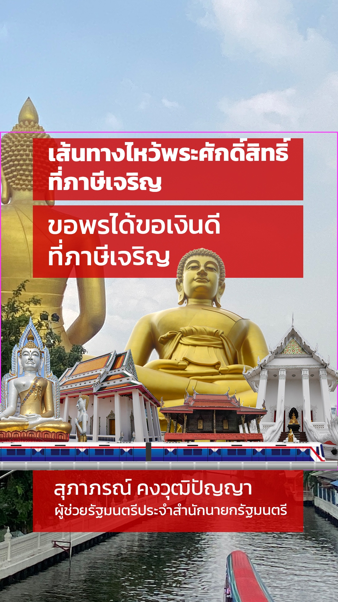 ผู้ช่วยรัฐมนตรีประจำสำนักนายกรัฐมนตรี สุภาภรณ์ คงวุฒิปัญญา อดีต ส.ส. พื้นที่ภาษีเจริญ พรรคเพื่อไทย เจ้าแม่ฝั่งธน เผยเคล็ดสุดปัง มูรับปีใหม่ ต้องไหว้ที่ไหนถึงจะปัง งานนี้เจ้าแม่ฝั่งธนมามาชี้เป้าเอง บอกเลยว่าสุดเริ่มจากวัดปากน้ำภาษีเจริญ ไหว้พระใหญ่เสร็จ เดินออกมาทางมหาเจดีย์มีทางเลี้ยวซ้ายเลาะกำแพงไปไม่ไกล ชมภาพเพนท์ผนังจาก โรงเรียนสตีรวัดอัปสรสวรรค์ไปตามรายทาง