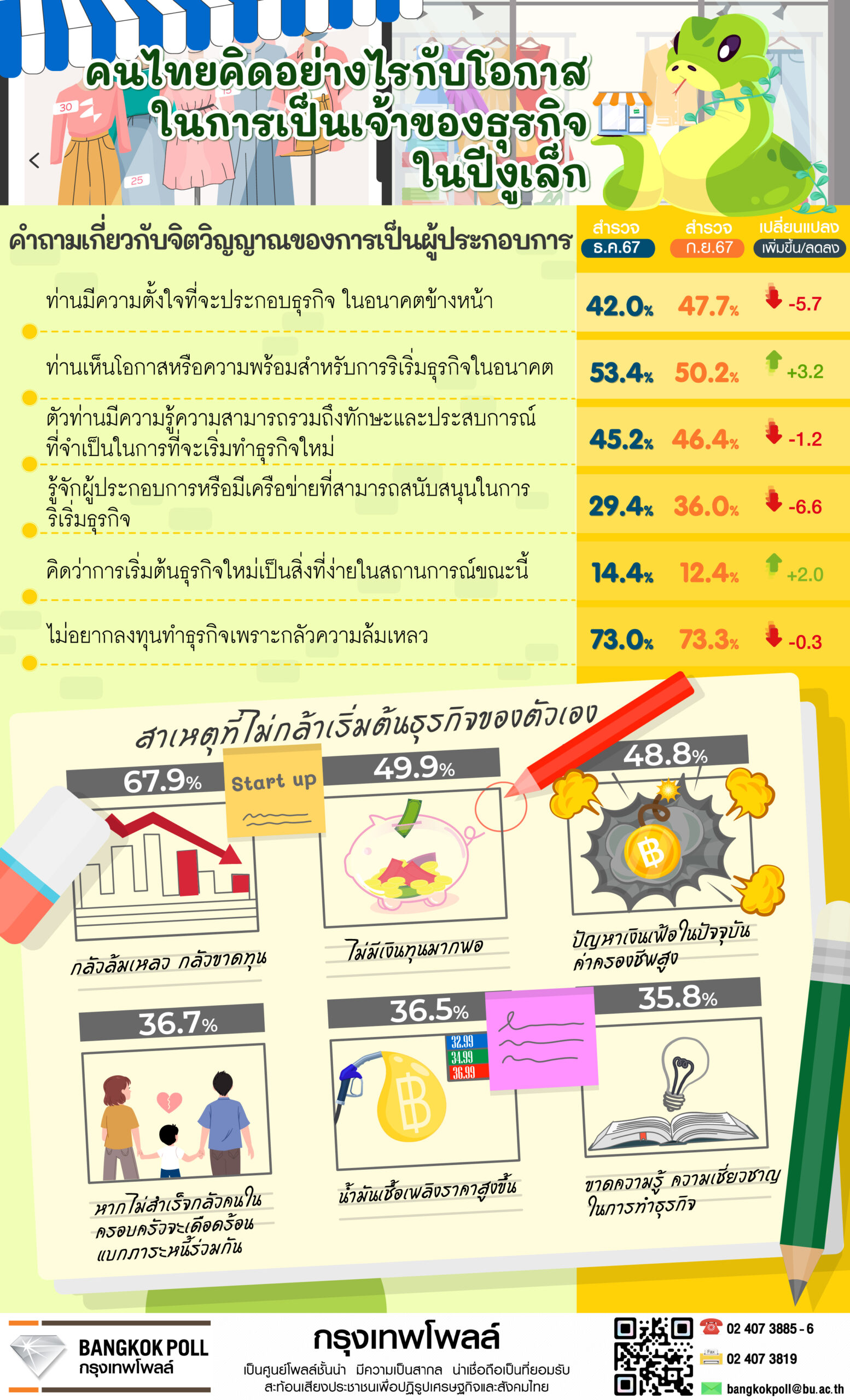 “กรุงเทพโพลล์” ร่วมกับคณะการสร้างเจ้าของธุรกิจและการบริหารกิจการ มหาวิทยาลัยกรุงเทพ สำรวจความเห็นประชาชนเรื่อง “คนไทยคิดอย่างไรกับโอกาสในการเป็นเจ้าของธุรกิจ ในปีงูเล็ก” โดยเก็บข้อมูลจากประชาชนทั่วประเทศ จำนวน 1,151 คน โดยการสุ่มสัมภาษณ์ทางโทรศัพท์ ระหว่างวันที่ 13 – 27 ธันวาคม 2567 ซึ่ง เป็นการสำรวจความเห็นเกี่ยวกับจิตวิญญาณของการเป็นผู้ประกอบการ (เจ้าของธุรกิจ) ประจำไตรมาส 4 ของปี 2567 โดยได้ทำการเปรียบเทียบกับการสำรวจครั้งที่ผ่านมา (ช่วงเดือน ก.ย. 2567) ในประเด็นต่างๆ