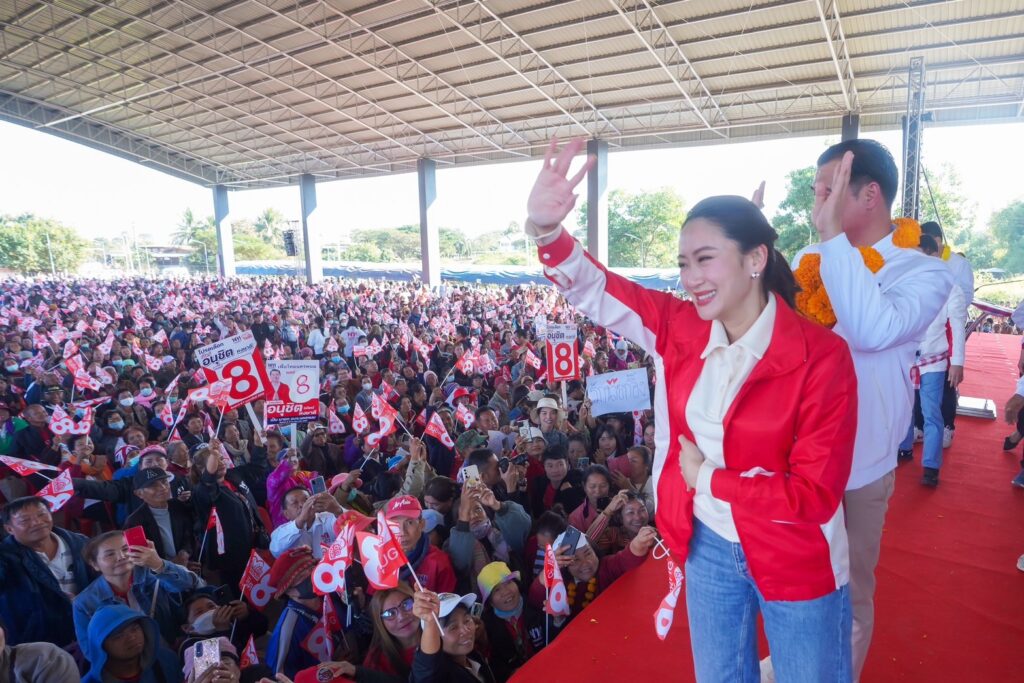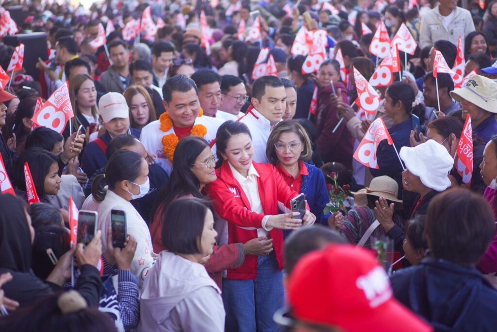 น.ส.แพทองธาร ชินวัตร หัวหน้าพรรคเพื่อไทย พร้อมคณะ เดินทางมาปราศรัยเวทีที่ 3 ที่อาคารโดมสวนสาธารณะเฉลิมพระเกียรติ มีประชาชนรอให้การต้อนรับอย่างคึกคัก
