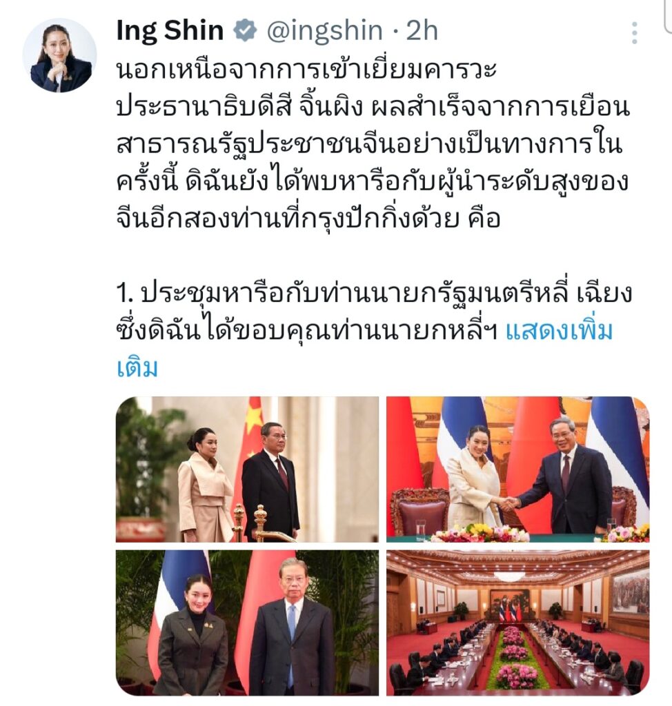 นางสาวแพทองธาร ชินวัตร นายกรัฐมนตรี ได้โพสต์ข้อความลงในสื่อสังคมออนไลน์ Facebook , X สรุปการเดินทางเยือนสาธารณรัฐประชาชนจีน ระบุว่า นอกเหนือจากการเข้าเยี่ยมคารวะประธานาธิบดีสี จิ้นผิง ผลสำเร็จจากการเยือนสาธารณรัฐประชาชนจีนอย่างเป็นทางการในครั้งนี้ ดิฉันยังได้พบหารือกับผู้นำระดับสูงของจีนอีกสองท่านที่กรุงปักกิ่งด้วย คือ
