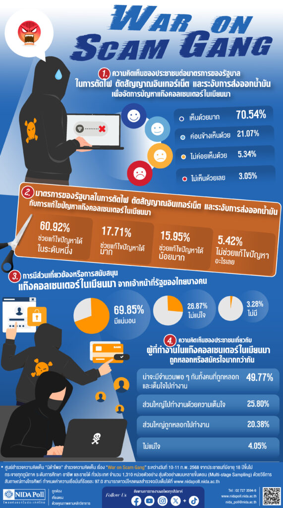 ศูนย์สำรวจความคิดเห็น “นิด้าโพล” สถาบันบัณฑิตพัฒนบริหารศาสตร์ (นิด้า) เปิดเผยผลการสำรวจของประชาชน เรื่อง “War on Scam Gang” โดยทำการสำรวจระหว่างวันที่ 10-11 กุมภาพันธ์ 2568 จากประชาชนที่มีอายุ 18 ปีขึ้นไปทั่วประเทศ รวมจำนวนทั้งสิ้น 1,310 หน่วยตัวอย่าง เกี่ยวกับมาตรการของรัฐบาลในการจัดการกับปัญหาแก๊งคอลเซนเตอร์ที่มีฐานในเมียนมา พบว่า