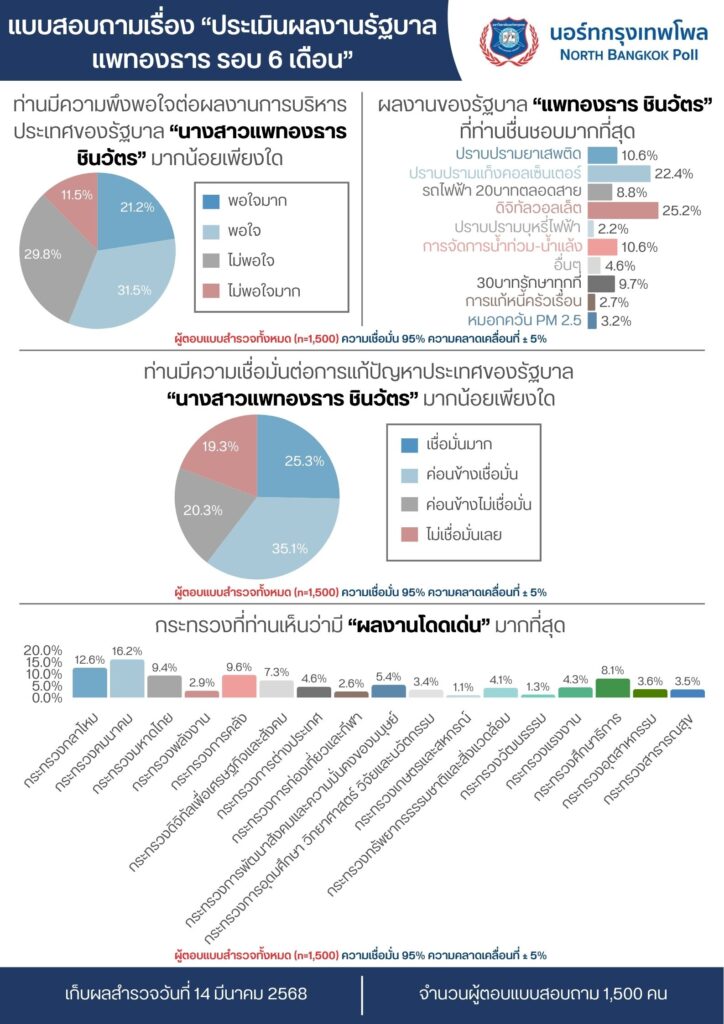 ผศ.ดร.สานิต ศิริวิศิษฐ์กุล หัวหน้าศูนย์สำรวจความคิดเห็น นอร์ทกรุงเทพโพล มหาวิทยาลัยนอร์ทกรุงเทพ เปิดเผยว่า เมื่อวันที่ 15 2568 ได้ทำการสำรวจประชาชนในหัวข้อ “ประเมินผลงานรัฐบาล แพทองธาร รอบ 6 เดือน” โดยมีผู้สำรวจจำนวน 1,500 ราย จากทั่วทุกภูมิภาค โดยได้สอบถามผู้ให้สำรวจถึง “ความพึงพอใจต่อผลงานการบริหารประเทศของรัฐบาล นางสาวแพทองธาร ชินวัตร มากน้อยเพียงใด” ซึ่งประชาชนส่วนใหญ่มีความพึงพอใจ 52.7% แบ่งเป็น พอใจมาก 21.2% และ พอใจ 31.5% ขณะเดียวกันมีบางส่วนให้ความเห็นว่าไม่พอใจ 29.8% และไม่พอใจมาก 11.5%