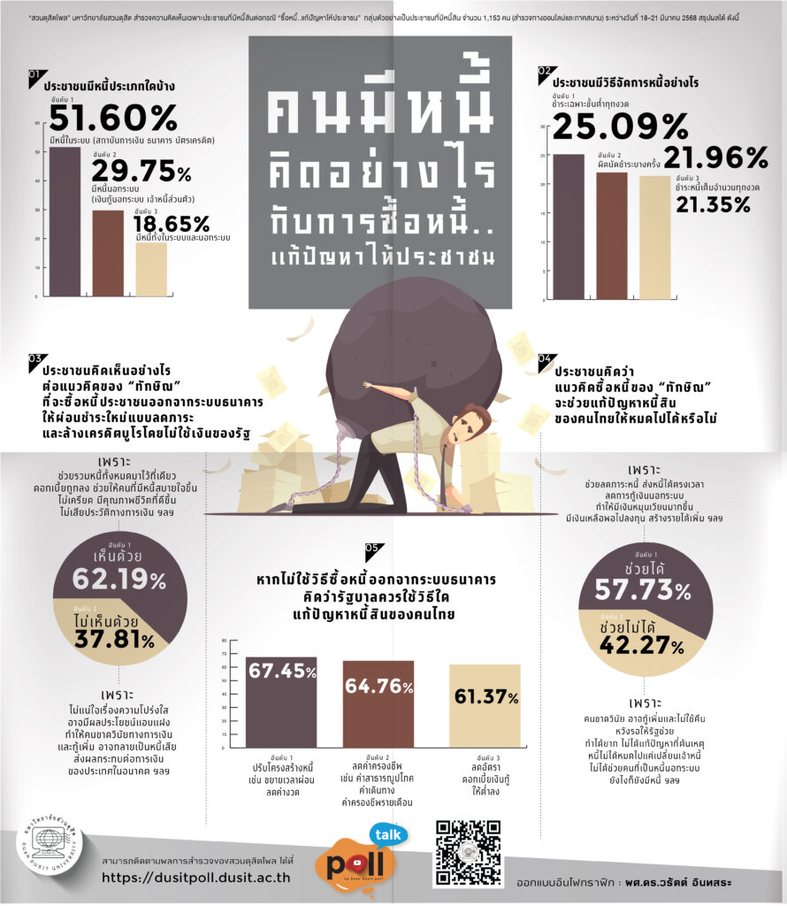 สวนดุสิตโพล มหาวิทยาลัยสวนดุสิต เปิดเผยผลสำรวจความคิดเห็นเฉพาะประชาชนที่มีหนี้สินต่อกรณี “ซื้อหนี้ แก้ปัญหาให้ประชาชน” กลุ่มตัวอย่างเป็นประชาชนที่มีหนี้สิน จำนวน 1,153 คน โดยทำการสำรวจทางออนไลน์และภาคสนาม ระหว่างวันที่ 18-21 มีนาคม 2568 พบว่า กลุ่มตัวอย่างมีหนี้ในระบบ (สถาบันการเงิน ธนาคาร บัตรเครดิต) มากที่สุด ร้อยละ 51.60 ขณะที่ มีหนี้นอกระบบ (เงินกู้นอกระบบ เจ้าหนี้ส่วนตัว) มีร้อยละ 29.75 และมีหนี้ทั้งในระบบและนอกระบบ ร้อยละ 18.65