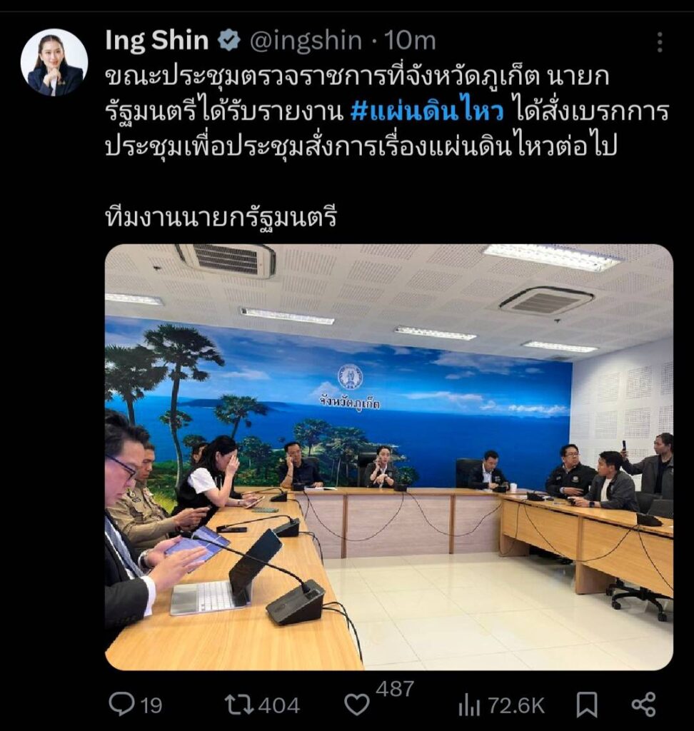 ผู้สื่อข่าวรายงานว่า ขณะนี้นางสาวแพทองธารชินวัตร นายกรัฐมนตรี ได้สั่งเบรกการประชุม ติดตอนนโยบายด้านการท่องเที่ยวจังหวัดภูเก็ต ณ ศาลากลาง จังหวัดภูเก็ต หลังรับทราบรายงานแผ่นดินไหวในเมียนมา ส่งผลกระทบถึงประเทศไทย เพื่อประชุมด่วน ร่วมกับนายอนุทิน ชาญวีรกูล รองนายกรัฐมนตรีและรัฐมนตรีว่าการกระทรวงมหาดไทย เพื่อติดตามสถานการณ์ อย่างใกล้ชิด