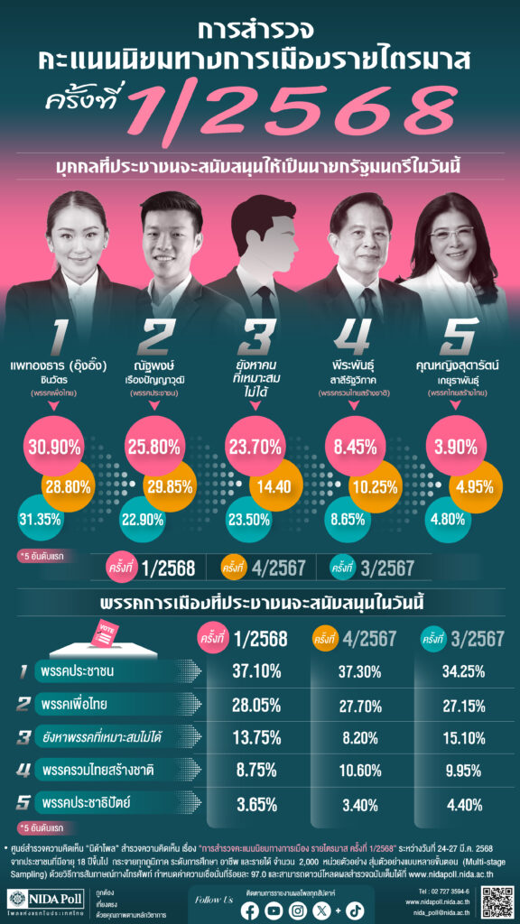 ศูนย์สำรวจความคิดเห็น “นิด้าโพล” สถาบันบัณฑิตพัฒนบริหารศาสตร์ (นิด้า) เปิดเผยผลการสำรวจ เรื่อง “การสำรวจคะแนนนิยมทางการเมืองรายไตรมาส ครั้งที่ 1/2568” โดยทำการสำรวจระหว่างวันที่ 24-27 มีนาคม 2568 จากประชาชนที่มีอายุ 18 ปีขึ้นไป ทั่วประเทศ รวมจำนวนทั้งสิ้น 2,000 หน่วยตัวอย่าง พบว่า จากการสำรวจเมื่อถามถึงบุคคลที่ประชาชนจะสนับสนุนให้เป็นนายกรัฐมนตรีในวันนี้ พบว่า