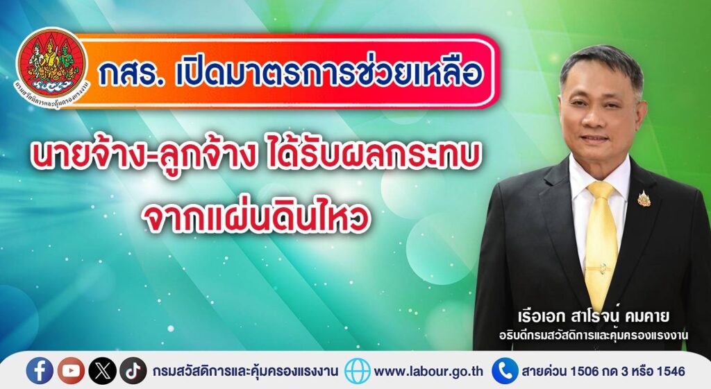 “กระทรวงแรงงาน โดยกรมสวัสดิการและคุ้มครองแรงงาน จะดูแลและสนับสนุนทั้งนายจ้างและลูกจ้างที่ได้รับผลกระทบจากเหตุการณ์แผ่นดินไหวอย่างเต็มที่ เพื่อให้ทุกฝ่ายสามารถฟื้นฟูและกลับมาดำเนินการได้ตามปกติเร็วที่สุด”