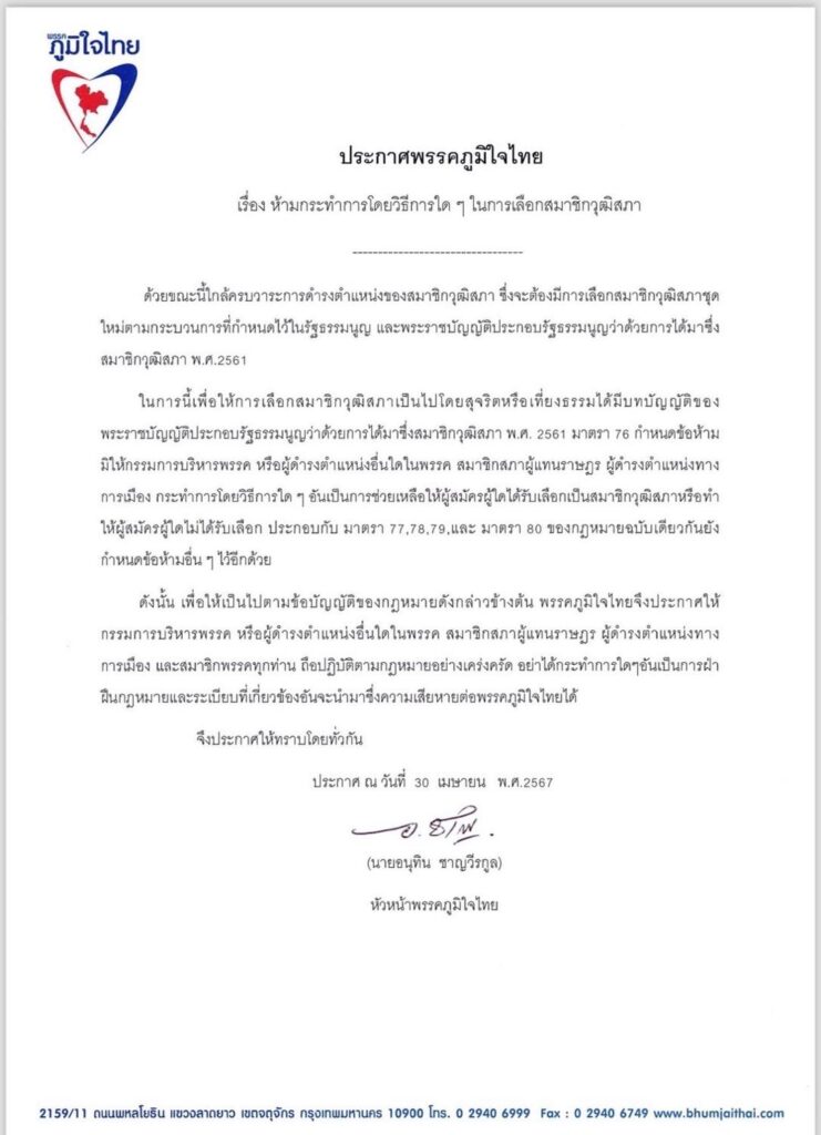 นายศุภชัย ใจสมุทร ทีมกฎหมายพรรคภูมิใจไทย (ภท.) กล่าวถึงกรณีที่นายณฐพร โตประยูร ได้ยื่นคำร้องต่อ คณะกรรมกาคการเลือกตั้ง (กกต.) ให้ส่งเรื่องให้ศาลรัฐธรรมนูญวินิจฉัย สมาชิกภาพของสมาชิกวุฒิสภา (สว.) โดยเนื้อหาในคำร้องดังกล่าวมีการพาดพิงถึงพรรคภูมิใจไทยนั้น ว่า ข้อความดังกล่าวมีลักษณะใส่ร้ายด้วยความเท็จต่อพรรคภูมิใจไทย ทั้งๆ ที่นายณฐพรรู้ดีว่า พรรคภูมิใจไทยโดยนายอนุทิน ชาญวีรกูล หัวหน้าพรรค หรือบุคคลใดในพรรคไม่ได้มีพฤติการหรือกระทำการใดตามที่ได้บรรยายไว้ในคำร้อง พรรคภูมิใจไทยมิได้มีส่วนเกี่ยวข้องกับการเลือก สว.มาตั้งแต่ต้น พรรคโดยหัวหน้าพรรคก็ได้ออกหนังสือลงวันที่ 30 เม.ย.2567 มาโดยชัดแจ้งว่า “ห้ามมิให้ สส.หรือสมาชิกของพรรคยุ่งเกี่ยวกับกระบวนการสรรหา สว.” และทุกคนต่างก็ยึดถือปฏิบัติอย่างเคร่งครัดและเมื่อวุฒิสภาได้เกิดขึ้นแล้วการปฏิบัติหน้าที่ของวุฒิสภาก็เป็นการดำเนินการตามหน้าที่อำนาจตามกฎหมาย