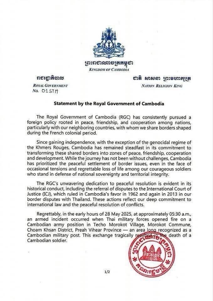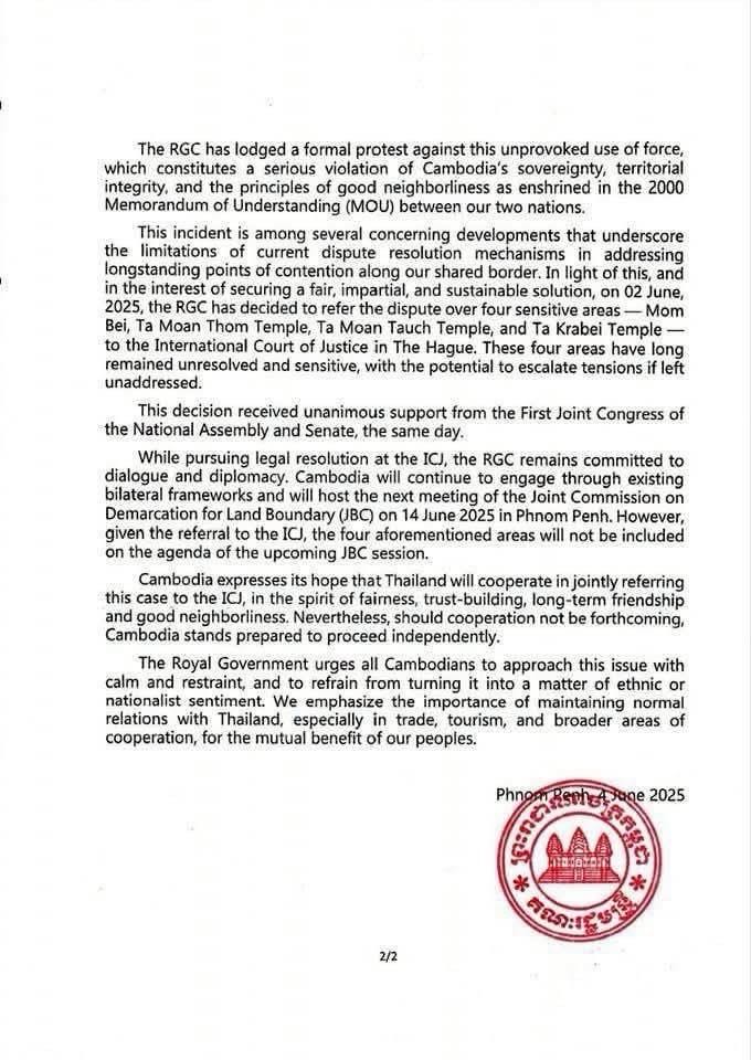 รายงานข่าวจากหน่วยงานความมั่นคง เปิดเผยว่า เมื่อวันที่ 4 มิ.ย. ทางรัฐบาล กัมพูชาได้ออกแถลงการณ์เป็นภาษาอังกฤษ 1 ฉบับ เพื่อแสดงจุดยืนว่า ประเทศกัมพูชา จะยังคงนำปัญหาในพื้นที่มุมเบ็ย (ช่องบก) ปราสาทตาเมือนธม ปราสาทตาเมือนโต๊ด และปราสาทตาควาย ให้ศาลยุติธรรมระหว่างประเทศ (ICJ) กรุงเฮก ประเทศเนเธอร์แลนด์ เป็นผู้แก้ไขปัญหา และจะไม่เจรจาทวิภาคีกับฝ่ายไทย ซึ่งหากมีการประชุม JBC วันที่ 14 มิ.ย.68 ที่ประเทศกัมพูชาเป็นเจ้าภาพ ทางกัมพูชาก็จะไม่นำปัญหาข้อขัดแย้ง ในพื้นที่ชายแดน มาบรรจุในการประชุมพูดคุย
