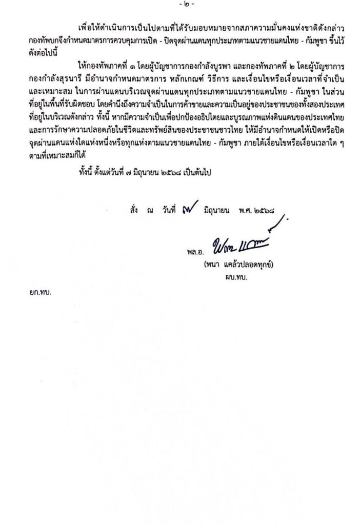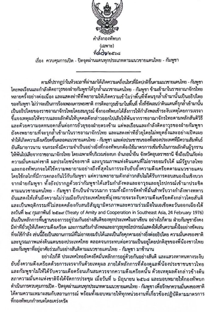 พล.อ.พนา แคล้วปลอดทุกข์ ผู้บัญชาการทหารบก ลงนามในคำสั่งกองทัพบก ที่ 806/2568 เรื่อง ควบคุมการเปิด-ปิดจุดผ่านแดนทุกประเภทตามแนวชายแดนไทย-กัมพูชา โดยที่ปรากฏว่าในห้วงเวลาที่ผ่านมา ได้เกิดความเคลื่อนไหวที่ผิดปกติขึ้นตามแนวชายแดนไทย-กัมพูชา โดยพลเรือนและกําลังติดอาวุธของฝ่ายกัมพูชาได้รุกล้ำแนวชายแดนไทย-กัมพูชา ข้ามเข้ามาในราชอาณาจักรไทยหลายครั้งอย่างต่อเนื่อง และแสดงท่าทีที่พยายามให้เกิดความเข้าใจว่าพื้นที่ตนรุกล้ำเข้ามานั้นเป็นของกัมพูชา ไม่ว่าจะเป็นการร้องเพลงเคารพธงชาติ การติดอาวุธเข้ามาในพื้นที่ ทั้งที่ชัดเจนว่าดินแดนที่รุกล้ำเข้ามานั้นเป็นของราชอาณาจักรไทยโดยสมบูรณ์