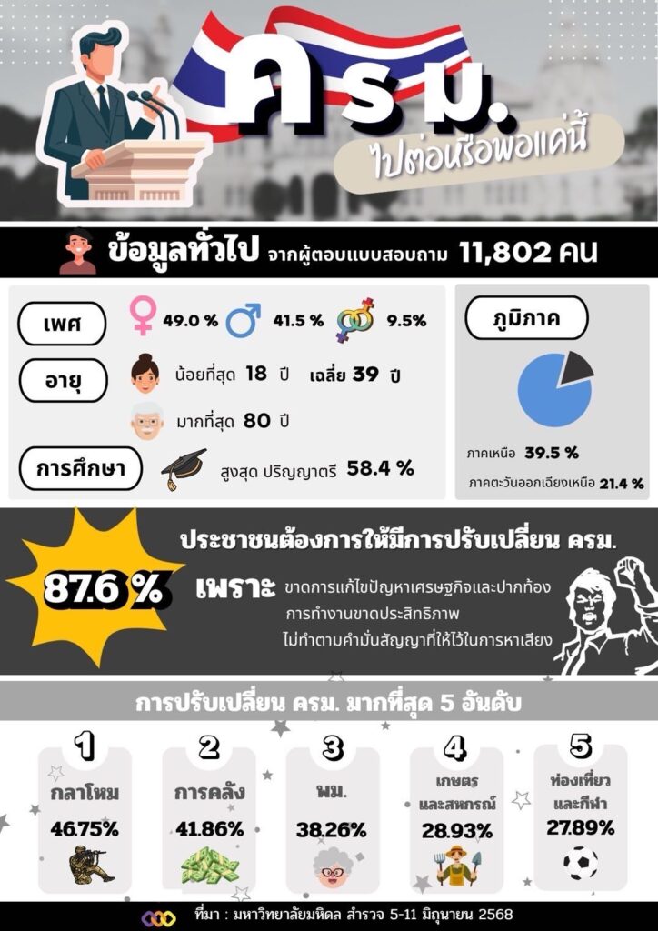 รศ.ดร.สุณีย์ กัลยะจิตร และคณะ คณะสังคมศาสตร์และมนุษยศาสตร์ มหาวิทยาลัยมหิดล เปิดเผย ผลสำรวจประเด็น ‘คนไทยต้องการปรับ ครม.หรือไม่” ของ คณะสังคมศาสตร์และมนุษยศาสตร์ มหาวิทยาลัยมหิดล โดยเป็นการสำรวจทัศนคติและความคิดเห็นด้านสถานการณ์การศึกษาและปัญหาที่เป็นกระแสสังคม ในพื้นทั่วทุกภูมิภาคของประเทศ คณะผู้วิจัยประยุกต์ใช้การวิจัยเชิงสำรวจด้วยการลงพื้นที่สัมภาษณ์แบบเผชิญหน้า (face to face) และการสัมภาษณ์ทางโทรศัพท์ (phone survey) โดยใช้แบบสัมภาษณ์ผ่านช่องทางออนไลน์จากกลุ่มตัวอย่าง จำนวน 11,802 ตัวอย่าง ในช่วงระหว่างวันที่ 5 -11 มิถุนายน 2568