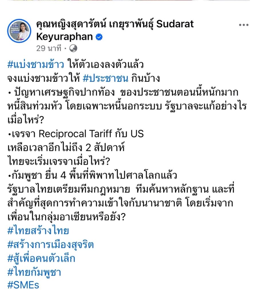 คุณหญิงสุดารัตน์ เกยุราพันธุ์ หัวหน้าพรรคไทยสร้างไทย โพสต์ข้อความผ่านเฟสบุ๊ก ระบุว่า คุณแบ่งชามข้าวให้ตัวเองลงตัวแล้ว จงแบ่งชามข้าวให้ประชาชน กินบ้าง ปัญหาเศรษฐกิจปากทัอง ของประชาชนตอนนี้หนักมาก หนี้สินท่วมหัว โดยเฉพาะหนี้นอกระบบ รัฐบาลจะแก้อย่างไร เมื่อไหร่ เจรจา Reciprocal Tariff กับ US