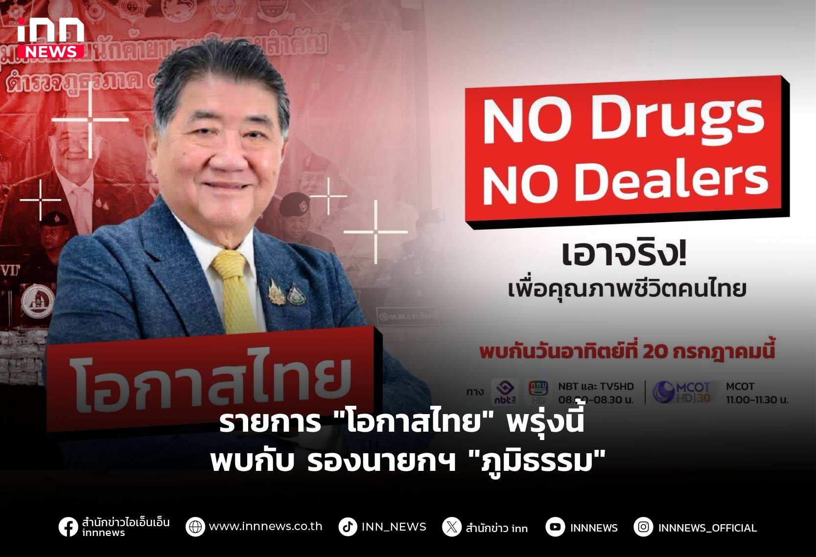 รัฐบาลชวนชมรายการ “โอกาสไทย” พรุ่งนี้ พบกับ รองนายกฯ “ภูมิธรรม” ติดตามปราบปรามยาเสพติด จัดระเบียบสังคม เวลา 08.00 น.ทาง NBT
