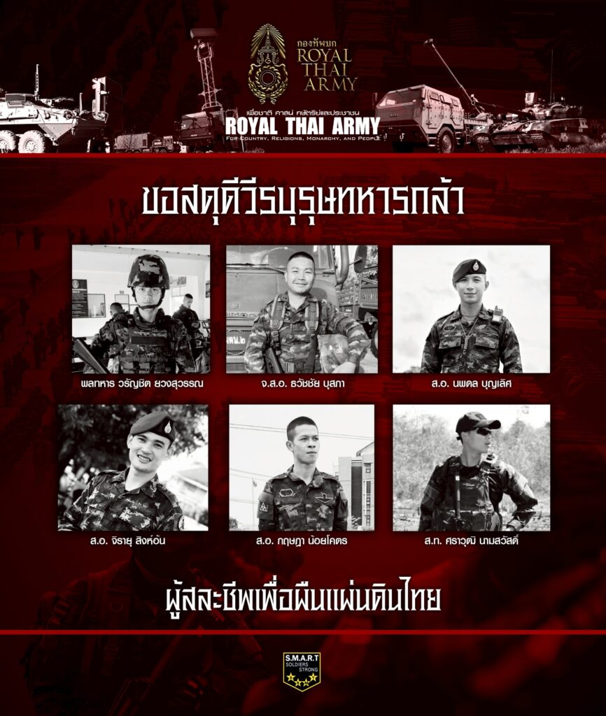 การเสียสละของทหารกล้าจะถูกจารึกไว้ในความทรงจำของผู้ร่วมรบ และจะสถิตอยู่ในหัวใจของทหารทุกนายตลอดไป จากเหตุการณ์ปะทะบริเวณชายแดนไทย–กัมพูชา เมื่อวันที่ 24–25 กรกฎาคม 2568 กำลังพลจากกองทัพภาคที่ 2 ซึ่งปฏิบัติหน้าที่อย่างกล้าหาญในการพิทักษ์อธิปไตยของชาติ ได้เสียชีวิตจากการปฏิบัติภารกิจด้วยความกล้าหาญและเสียสละ จำนวน 6 นาย ได้แก่