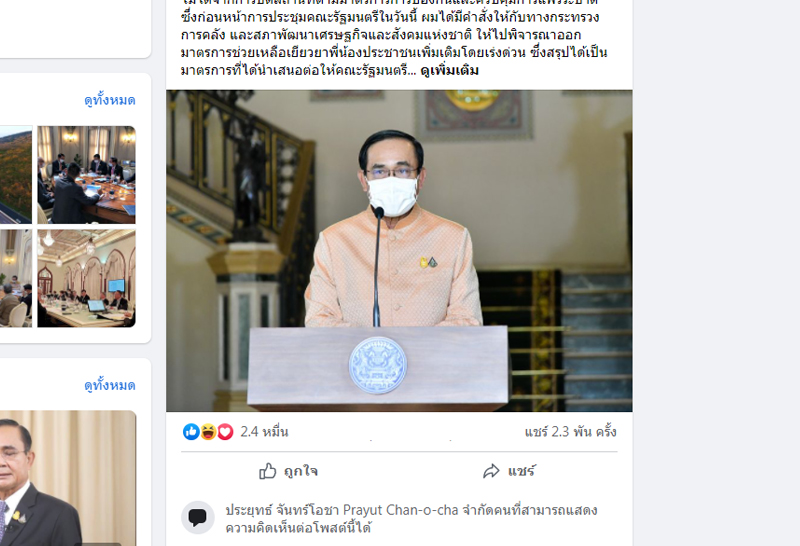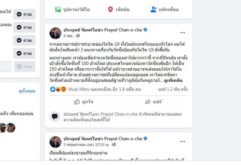 เฟซบุ๊ก พล.อ.ประยุทธ์ จันทร์โอชานายกรัฐมนตรีและรัฐมนตรีว่าการกระทรวงกลาโหม ได้ปิดโหมดไม่ให้เข้ามาแสดงความคิดเห็น โดยมีการปิดตั้งแต่วันที่ 5 พ.ค.ที่ผ่านมา แต่ยังโพสต์ข้อความสื่อสารบน เฟซบุ๊กนายกฯ กับประชาชนมาอย่างต่อเนื่อง เพื่อให้ทราบถึงความคืบหน้าในการบริหารราชการ โดยเฉพาะการแก้ไขปัญหาสถานการณ์โควิด-19