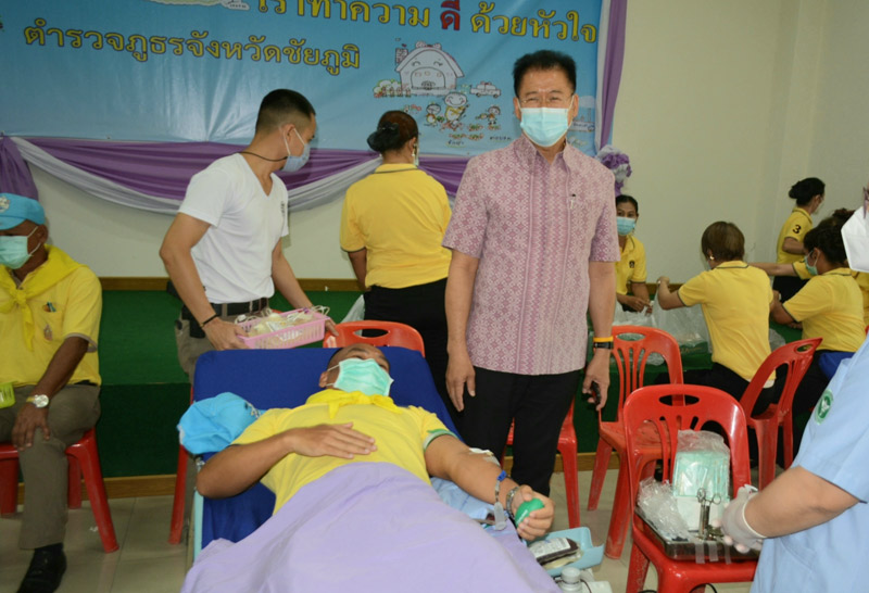 โดยมีนายวิเชียร จันทรโณทัย ผู้ว่าราชการจังหวัดชัยภูมิ ได้เดินทางมาให้กำลังใจกับ ข้าราชการตำรวจจิตอาสาบริจาคโลหิต พร้อมทั้งนางณัฏฐินีภรณ์ จันทรโณทัยนายกเหล่ากาชาด จ.ชัยภูมิ นำคณะเหล่ากาชาดจังหวัดชัยภูมิ ออกรับบริจาคร่วมกับ นาง มณฑิชา สุขจันทร์ ประธานแม่บ้านตำรวจ ภ.จว.ชัยภูมิ คณะ , รอง ผบก.ฯ , หัวหน้าสถานี 29 สภ. คณะแพทย์พยาบาล และข้าราชการตำรวจจิตอาสา ร่วมพิธีในครั้งนี้