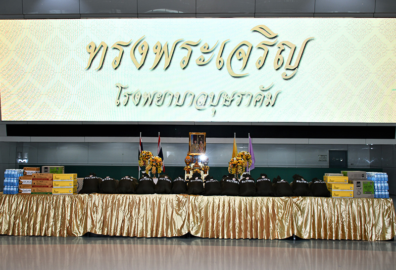 วันนี้ (12 มิถุนายน 2564) นายแพทย์เกียรติภูมิ วงศ์รจิต ปลัดกระทรวงสาธารณสุข ให้สัมภาษณ์ ว่า พระบาทสมเด็จพระเจ้าอยู่หัวและสมเด็จพระนางเจ้าฯ พระบรมราชินี ทรงพระกรุณาโปรดเกล้าโปรดกระหม่อม ให้พลตรี นพสิทธิ์ สิทธิพงศ์โสภณ ผู้อำนวยการกองโครงการในพระองค์และสารนิเทศ กองกิจการวัง กองบัญชาการทหารมหาดเล็กราชวัลลภรักษาพระองค์ เป็นผู้แทนพระองค์ เชิญ ถุงพระราชทานกำลังใจ เครื่องอุปโภคบริโภค จำนวน 900 ถุง กล่องขนมพระราชทาน 18 ลัง อาหารกึ่งสำเร็จรูป 80 ลัง น้ำผลไม้ดอยคำ 50 ลัง นมยูเอชทีสวนจิตรลดา 50 ลัง ขนม 160 ลัง คุกกี้สวนจิตรลดา 20 ลัง และน้ำดื่มสวนจิตรลดา 200 แพ็ค ไปมอบให้แก่บุคลากรทางการแพทย์ โรงพยาบาลบุษราคัม อิมแพค เมืองทองธานี จังหวัดนนทบุรี เพื่อเป็นขวัญและกำลังใจในการปฏิบัติหน้าที่ดูแลผู้ป่วยโรคติดเชื้อไวรัสโคโรนา 2019 โดยมีนายแพทย์กิตติศักดิ์ อักษรวงศ์ ผู้อำนวยการโรงพยาบาลบุษราคัม ผู้บริหารกระทรวงสาธารณสุข ข้าราชการ และเจ้าหน้าที่โรงพยาบาลบุษราคัม เข้าร่วมพิธี นับเป็นพระมหากรุณาธิคุณเป็นล้นพ้นอย่างหาที่สุดมิได้ ที่พระบาทสมเด็จพระเจ้าอยู่หัวและสมเด็จพระนางเจ้าฯ พระบรมราชินี ทรงติดตามสถานการณ์การแพร่ระบาดของโรคโควิด-19 อย่างใกล้ชิด ทรงรับรู้ถึงความเหน็ดเหนื่อยและความอ่อนล้า จากการทุ่มเทกำลังกายและกำลังใจในการรักษาพยาบาลผู้ป่วยโรคโควิด-19