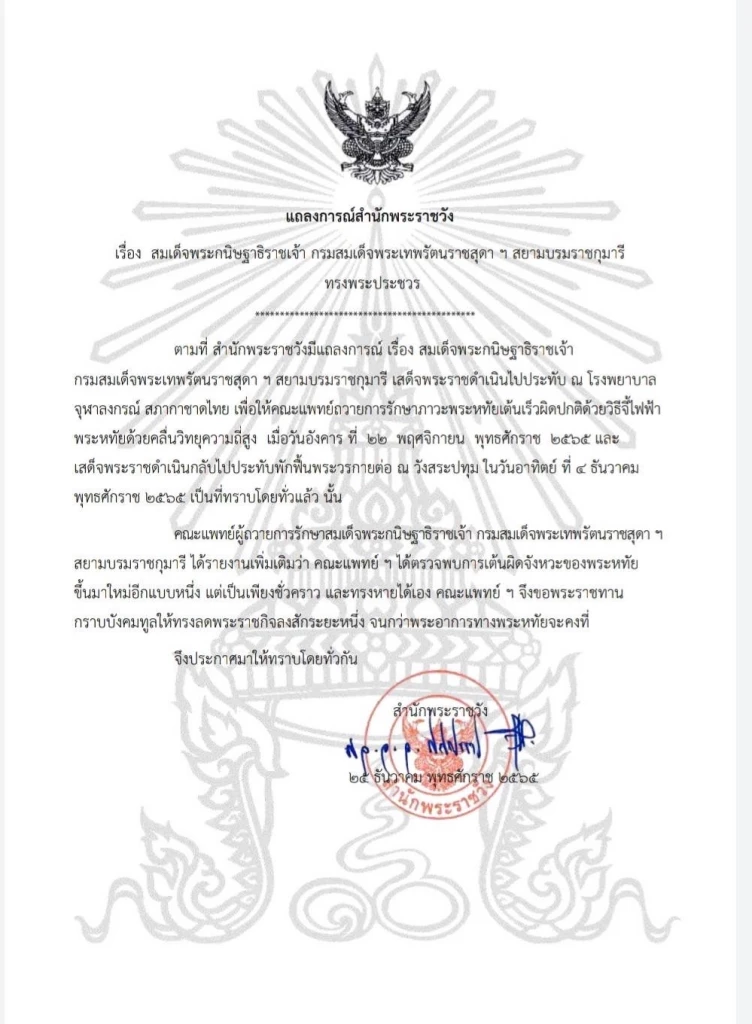 พระวรกายต่อ ณ วังสระปทุม ในวันอาทิตย์ ที่ 4 ธันวาคม พุทธศักราช 2565 เป็นที่ทราบโดยทั่วแล้ว นั้น