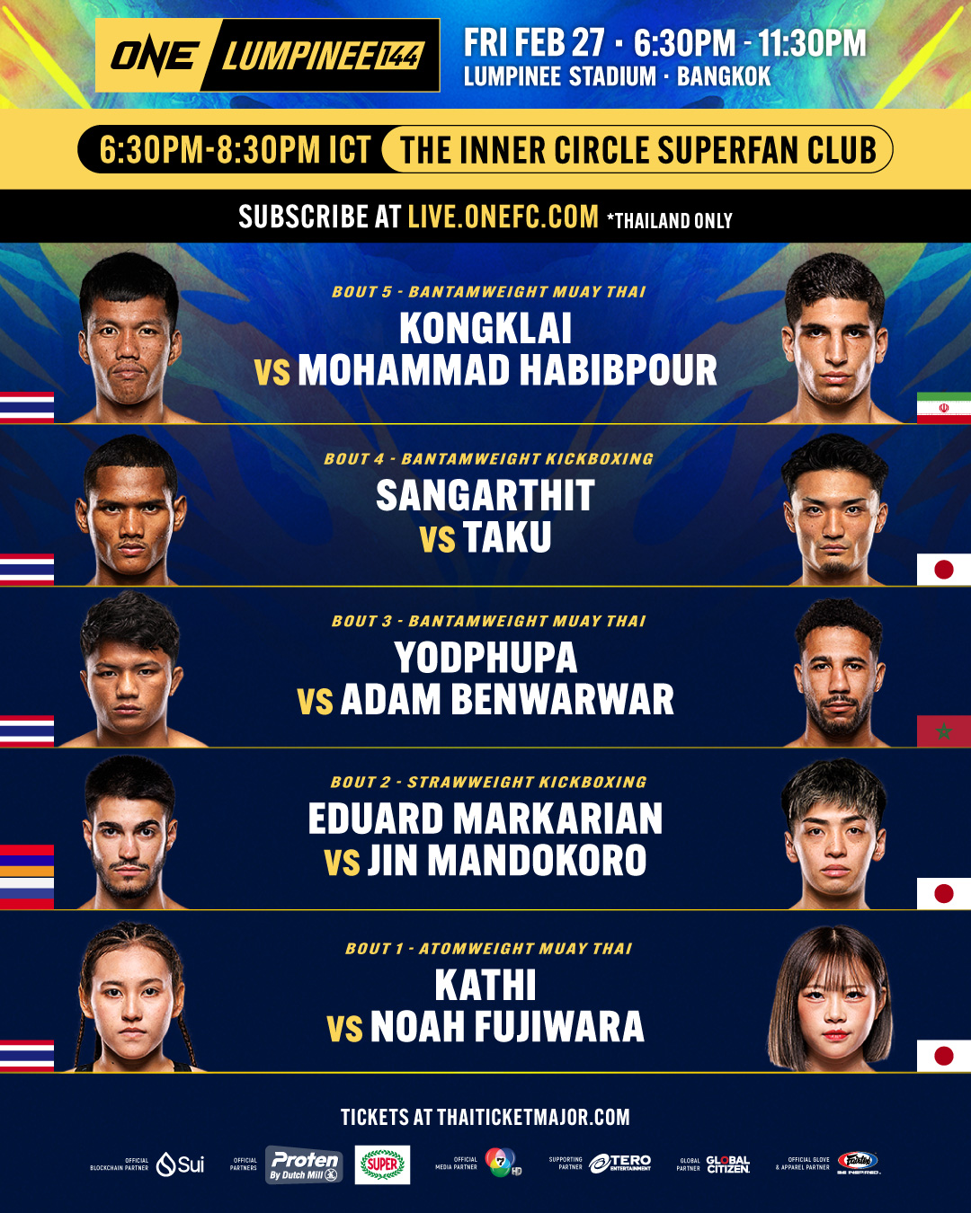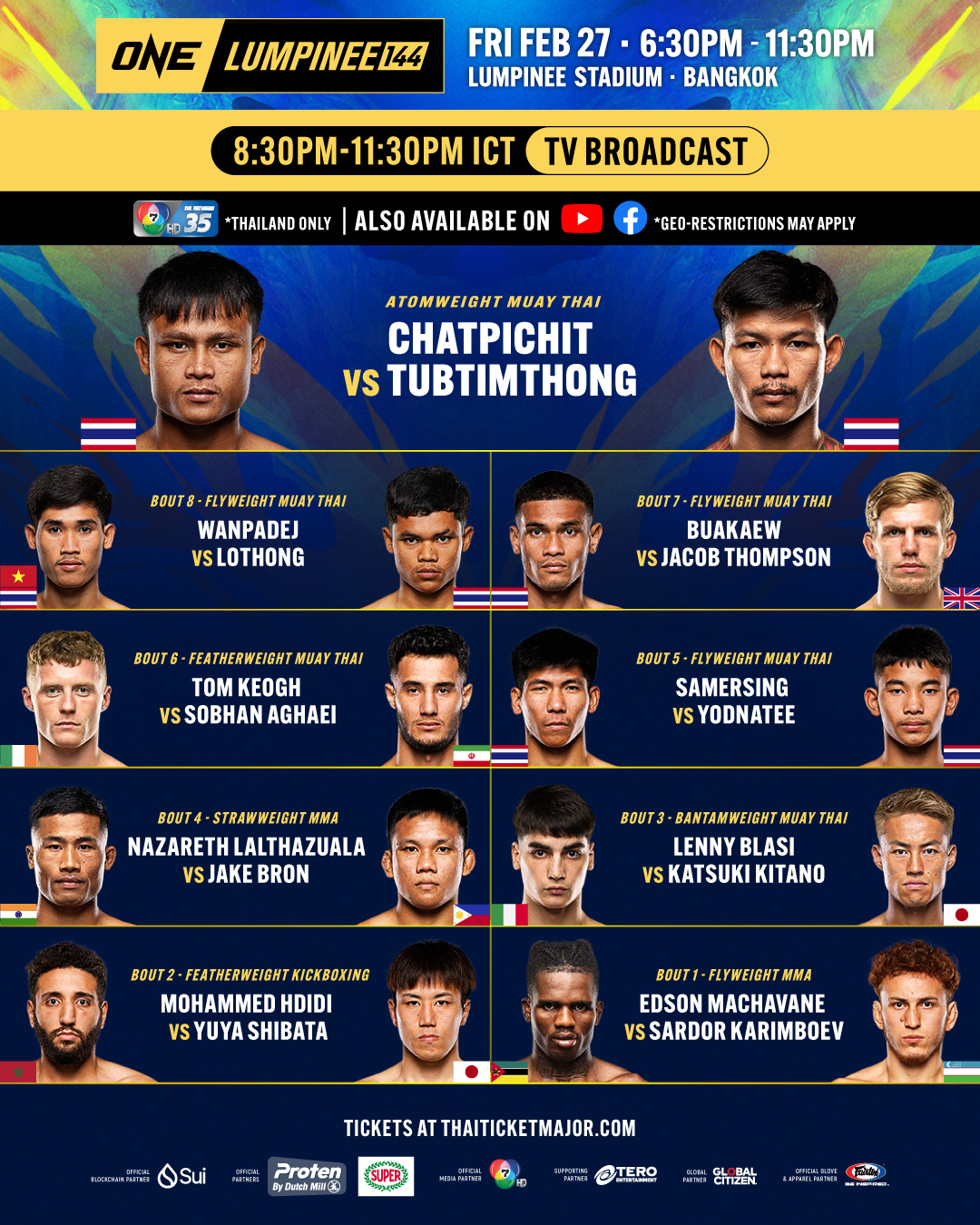 ONE เสิร์ฟโปรแกรมเดือดต่อเนื่องในศึก ONE ลุมพินี 144 พร้อมถ่ายทอดสดจากสนามมวยเวทีลุมพินี (รามอินทรา) ส่งถึงผู้ชมใน 195 ประเทศทั่วโลกในวันศุกร์ที่ 27 ก.พ. นี้ โดยจอมบู๊ทั้ง 28 คน ผ่านเกณฑ์การชั่งน้ำหนักและวัดระดับน้ำในร่างกายเป็นที่เรียบร้อย และจะสู้กันในพิกัดน้ำหนักตามที่ตกลงไว้ในสรุปผลด้านล่าง