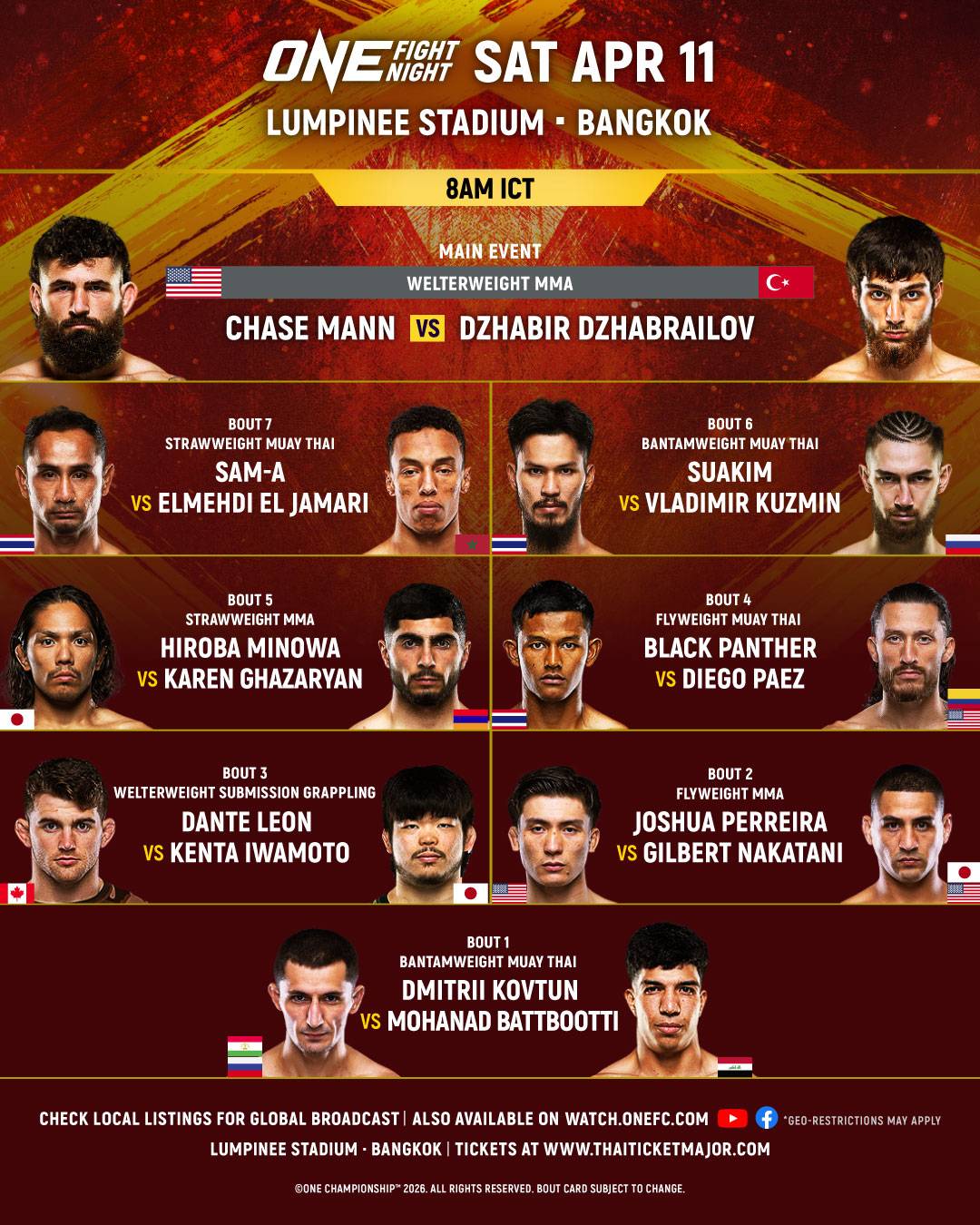 ONE สาดความสนุกส่งตรงถึงแฟนกีฬาศิลปะการต่อสู้ใน 195 ประเทศทั่วโลก ในศึก ONE Fight Night 42 ซึ่งจะถ่ายทอดสดจากสนามมวยเวทีลุมพินี (รามอินทรา) ในช่วงไพรม์ไทม์อเมริกา ตรงกับช่วงเช้าเวลา 08.00 น. ในวันเสาร์ที่ 11 เม.ย. นี้ โดยจอมบู๊ทั้ง 16 คนที่ร่วมแข่งขัน ได้ผ่านด่านการชั่งน้ำหนักและการวัดระดับน้ำในร่างกายเป็นที่เรียบร้อย