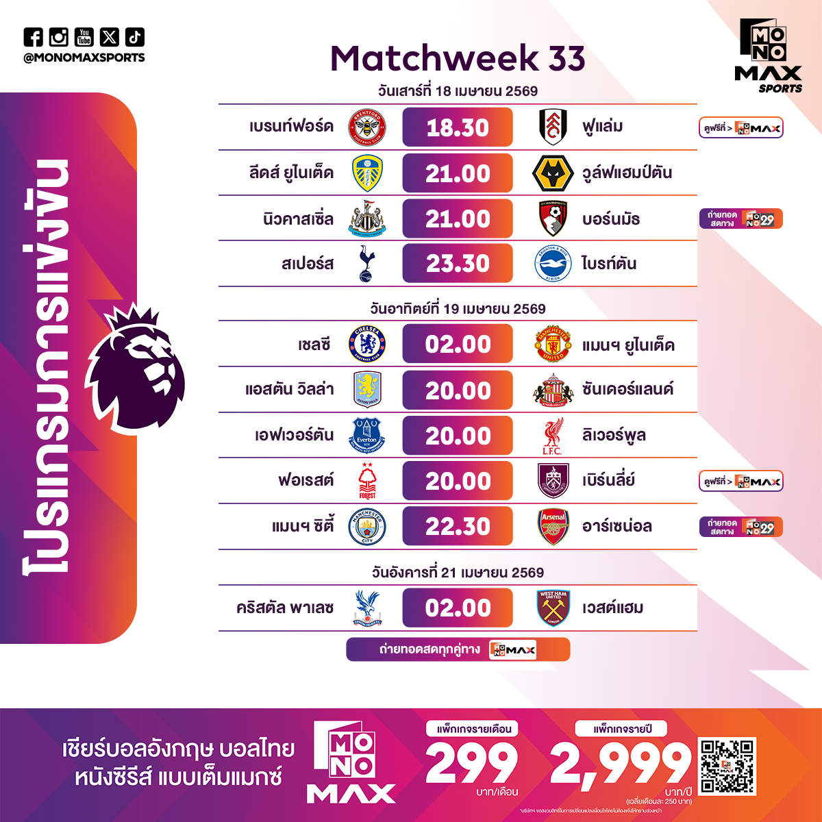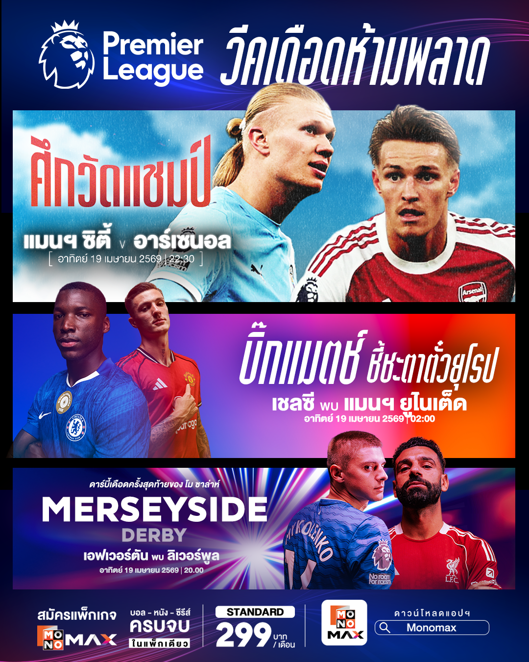 จากนั้นช่วงค่ำ วันอาทิตย์ที่ 19 เมษายน 2569 เวลา 20.00 น. Monomax ยิงสดพร้อมกันสามสนามเริ่มจาก แอสตัน วิลล่า พบ ซันเดอร์แลนด์ เจ้าบ้านหวังเก็บแต้มรักษาโมเมนตัม ขณะที่ทีมเยือนต้องการคะแนนหนีโซนอันตราย ต่อด้วยน็อตติ้งแฮม ฟอเรสต์ พบ เบิร์นลีย์ เกมสำคัญของทีมกลางตารางที่ทุกคะแนนมีความหมาย และ เมอร์ซีย์ไซด์ดาร์บี้ เอฟเวอร์ตัน เปิดบ้านรับ ลิเวอร์พูล ศึกแห่งศักดิ์ศรีเมืองลิเวอร์พูลที่มักเต็มไปด้วยความดุดัน เข้มข้น ใครอยากชมคู่นี้ริมหาดจอยักษ์ แบบมันส์ สะใจ สามารถตามไปพบกันได้ที่ “สงกรานต์ พัทยา Watch Party on the Beach” ในวันอาทิตย์ที่ 19 เมษายน 2569 ณ ชายหาดพัทยา ก่อนปิดท้ายคืนวันอาทิตย์กับซูเปอร์บิ๊กแมตช์ เวลา 22.30 น. แมนเชสเตอร์ ซิตี้ เปิดศึก อาร์เซน่อล ที่อาจเป็นเกมชี้ชะตาการลุ้นแชมป์ฤดูกาลนี้ การดวลแท็กติกระดับท็อประหว่างสองทีมลุ้นแชมป์ที่ห้ามพลาด โดยคู่นี้ถ่ายทอดสดทั้ง Monomax และ ช่อง MONO29